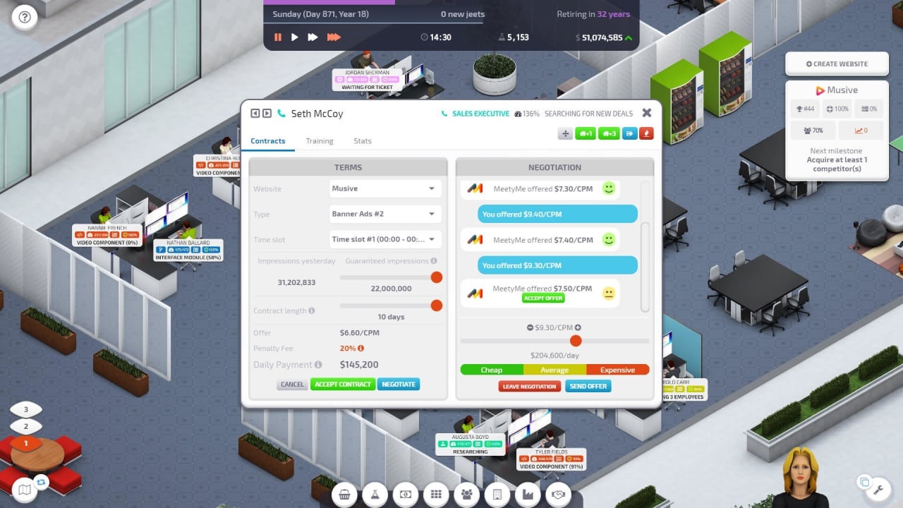 Ни один успешный проект не будет работать без грамотного управления. Игроку предстоит правильно улучшать и расширять функции веб-приложения, грамотно расширяя возможности хостинга и заниматься маркетинговым вопросом.