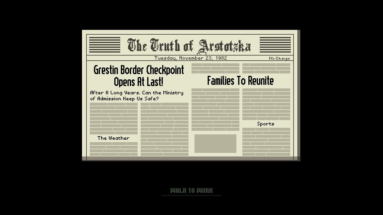 На плечи иммиграционной службы ложится проверка документов не только жителей Арстотцки, которые решили покинуть страну, но и проверка паспортов соседней страны — Колечией, которая недавно закончила войну с нашим государством, вернув часть территорий. По началу мы можем просто ставить в документах — «отказано» или «принято». Как только среди проходивших через вас людей появляются шпионы, контр-бандисты и наркоторговцы, уровень игры повышается. За каждую правильно поставленную печать игрок получает по 5 единиц игровой валюты. В конце дня он решается потратить их, спуская на дом, оплату еды, алкоголь или другие свои нужны. Со временем геймплей становится труднее, поскольку правительство каждый день диктует нам новые правила, не всегда усложняющие игру, а проходящие мимо люди вызывают подозрение в весе, поле, лице, и других документах, таких как пропуск на работу, разрешение на въезд, разрешение на хранение контрабанды.