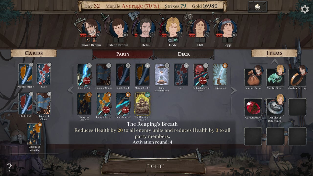 Внутри игровой структуры присутствуют пошаговые бои, исход которых порой можно решить одной картой, вытянутой с колоды. По мере продвижения по сюжету, мы получаем новых персонажей в отряд и прокачиваем старых. Как только мы встречаемся с врагами, игра переводит нас на боевое поле, где мы играем нашими персонажами по одному ходу, в котором можем ударить, использовать заклинание или достать карту из колоды.