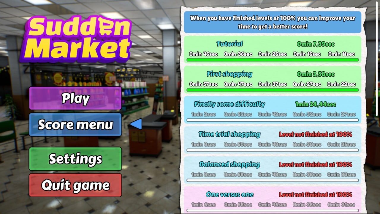 Sudden Market представляет собой аркаду с элементами экшена, трехмерной мультяшной графикой и видом от первого лица. Этот инди-тайтл можно назвать шуточным симулятором покупателя в супермаркете. По сюжету герой приходит в продуктовый магазин вскоре после его закрытия. Протагонист не собирается уходить. Он берет тележку и всё равно пробует заняться шопингом. Однако сотрудники службы охраны отказываются просто так на это смотреть, и потому стремятся ему помешать. Поведение этих врагов зависит от развиодности сложности. Всего их 3: легкий, средний и трудный. В самом начале можно пройти обучение и освоиться с механиками.