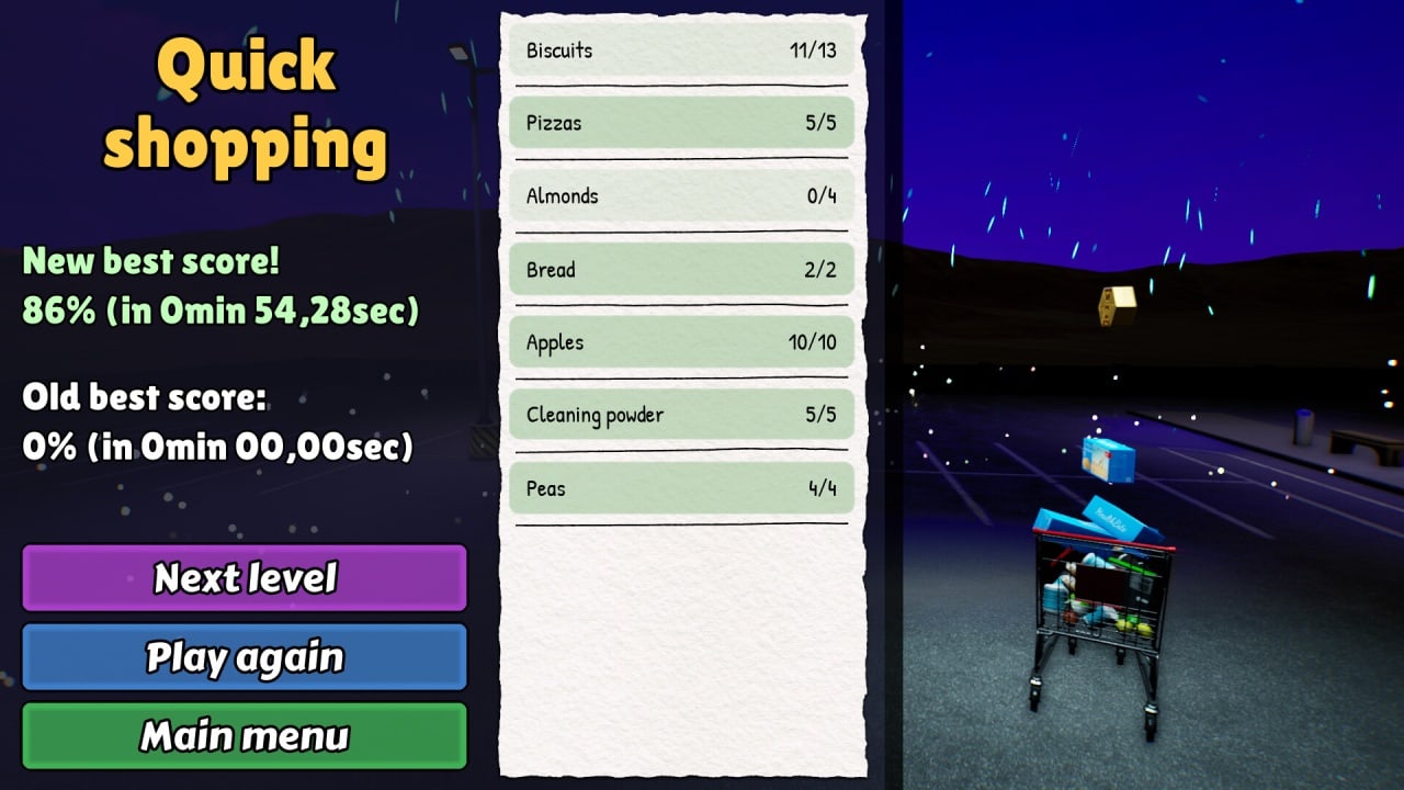 Игра Внезапный Маркет разделена на 12 уровней. Они постепенно становятся всё более сложными. Для каждой карты есть свой список покупок. Задача пользователя состоит в том, чтобы найти и собрать товары до истечения таймера. Затраченные минуты и секунды влияют на конечный результат. Можно проходить этапы повторно и устраивать спидраны, чтобы заработать больше очков. Всего здесь есть 250 моделей предметов, разбитых на 86 типов. Иногда на локациях попадаются дополнительные препятствия. Геймплей выглядит следующим образом. Юзер носится по торговым рядам, хватает на ходу овощи, фрукты, напитки, консервы, выпечку и так далее, следит за своей тележкой и убегает от охранников. Геймер может подбирать бонусы, что позволяют ему делать рывки.