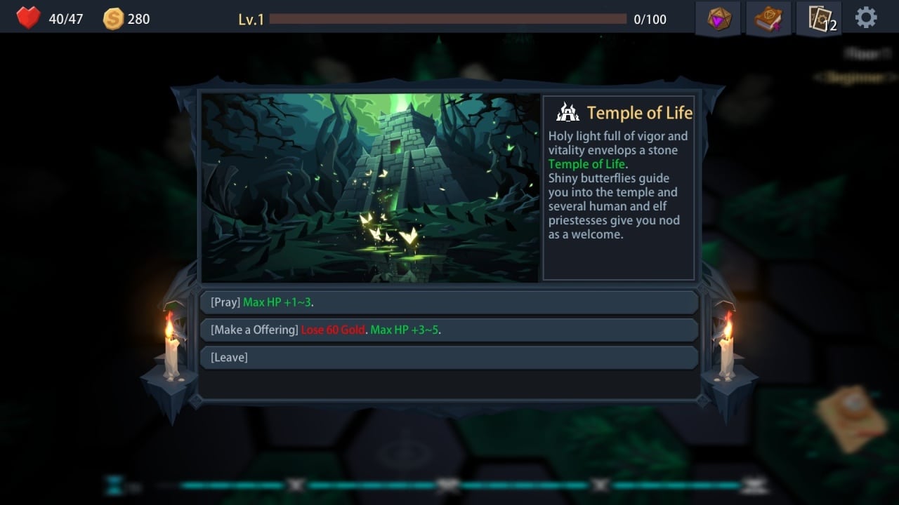 В игре доступно 13 уровней сложности на выбор. Система боя позволят отправляться в приключения, авантюрные вылазки и посредством этого постепенно, но уверенно повышать способности. Есть много контента, среди которого более 100 предметов, 340 карт-сил, 12 героев, а еще 80 типов сущностей. Каждый раз идя в подземелье, мир будет генерироваться по-другому, что позволит ни один поход не повторять.