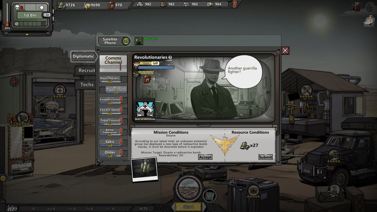 Исследуйте локации, которые сгенерированы случайным образом. Произведите захват нефтяных территорий и городов, узнайте месторождение противника и дайте имена революционерам. На локациях расположены сотни случайных событий и точек интереса. Собирайте свою команду и используйте уникальную тактику боя.