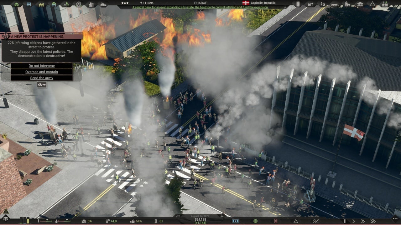 Юзер получает 60 видов политики для пользования. Они определяют политические и экономические вопросы. Центральный банк – основное строение для печатания денег, что помогает избежать банкротства, но может повысить уровень инфляции. Чтобы расширить нацию, потребуется захватывать новые земли. На других территориях обитают враждебные и нейтральные стороны, которые примкнут к нации геймера или сразятся с ним.