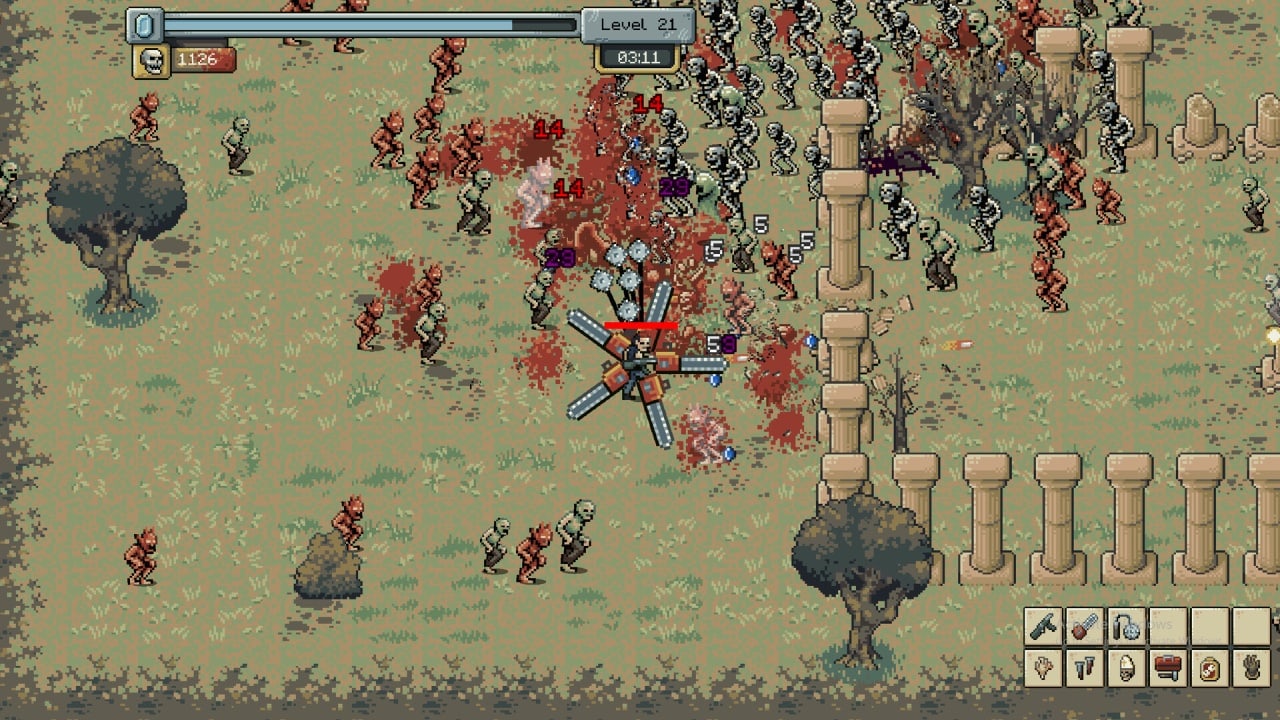 SuperTotalCarnage! – это экшен-рогалик с элементами автобатлера и хоррора. У него двухмерная пиксельная графика в стиле ретро. Камера расположена сбоку и сверху. В игре есть кровь и мясо. Здесь есть несколько персонажей, но изначально доступны не все. Всех остальных можно открыть по мере прохождения. Они различаются внешним видом, статами и начальным вооружением. Боец сам атакует противников. Так что игроку остается лишь перемещать своего подопечного по карте, уклоняясь от ближних атак недругов, и собирать выпадающие из них кристаллы. Они дают опыт. Накопив достаточное количество экспы, геймер повышает уровень. За каждый левелап ему разрешают выбрать один из 3 предметов. Это может быть новая пушка или артефакт с пассивными свойствами, либо апгрейд к уже имеющимся вещам. С собой можно носить 6 стволов и такое же количество реликвий.
