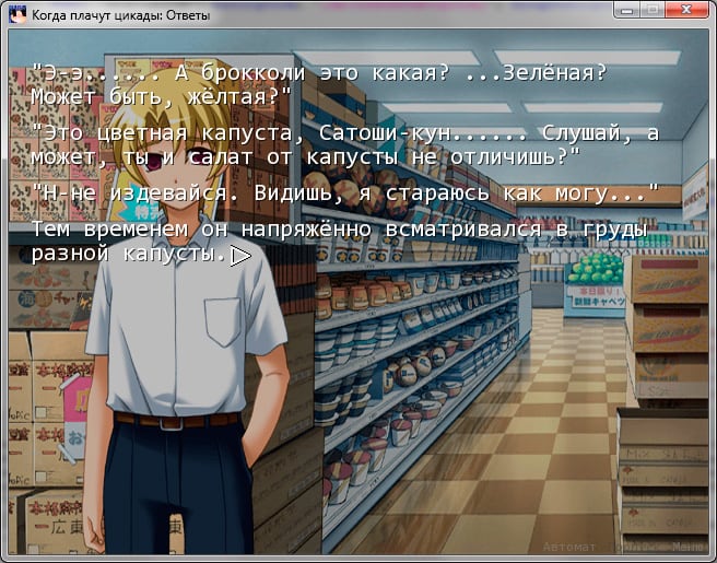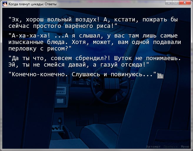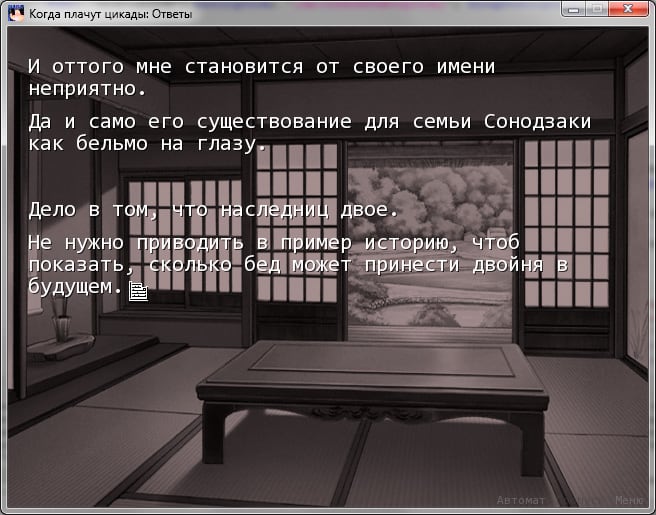 Пользователи в Когда плачут цикады: Ответы будут наблюдать за развитием происходящих событий, без возможности как либо повлиять на них. Новелла выполнена в кинетической повествовательной форме, где приходится перелистывать экраны с иллюстрациями, на которых нарисованы персонажи в аниме стилистике и выводятся текстовые сообщения, показывающие диалоги между героями. Придется читать мысли и разговоры протагонистов, что будут выступать центральными фигурами рассказа.