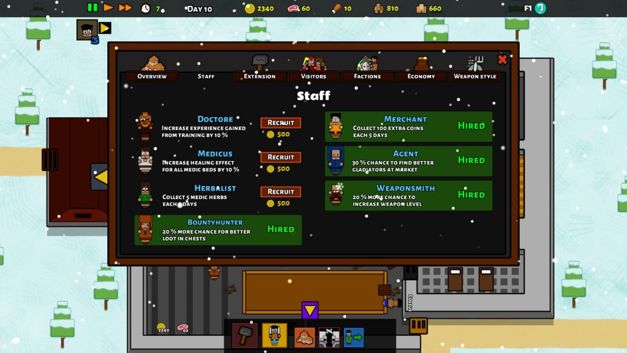 Gladiator School – необычный менеджмент, с элементами стратегии, где необходимо взять господство над рабами-гладиаторами, чтобы обогатиться на множественных соревнованиях. Вам доступен небольшой участок земли, на котором собственно и происходят основные события видеоигры. Тренируйте своих подопечных, следите за их жизненными показателями, подбирайте правильное вооружение, а после отправляйте в полномасштабные бои на аренах.