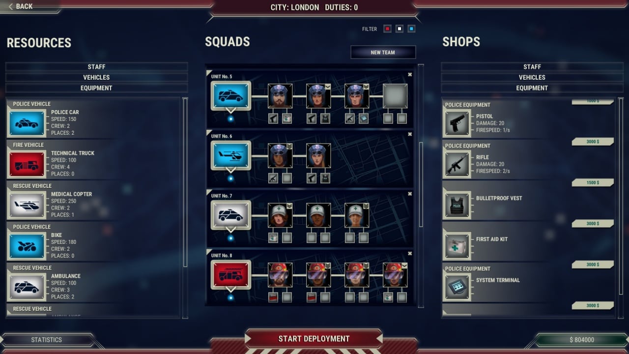 В вашем распоряжении будут отряды полиции, пожарники, медицинские работники. Чтобы грамотно и быстро организовать их отправление, вам придется указать вид транспорта, количество человек, вид содеянного — убийство, нападение, ограбление, инсульт, инфаркт, пожар, взрыв газовой трубы и другие. Также вы выбираете снаряжение, с которым поедет ваш отряд. Если необходимо спасти пожилого человека от инфаркта, то хватит медицинской машины, водителя, врача и двух медбратьев. Если совершили нападение на оружейный магазин, то вам понадобится вертолет, бронированная машина, бронежилеты и дюжина спецназа.