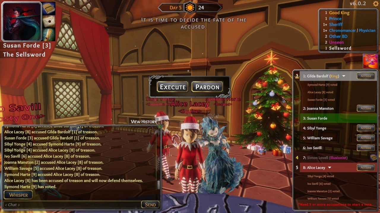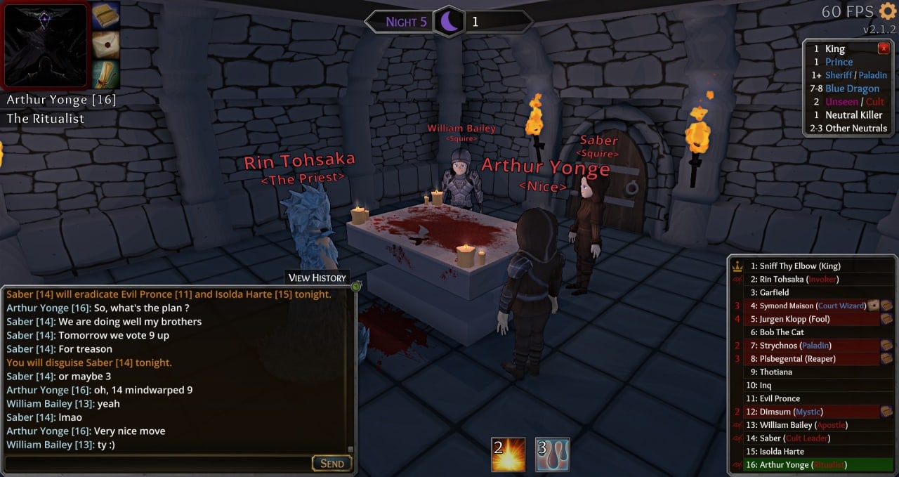 В партии принимает участие 16 живых участников действа. Каждый из юзеров получает фракцию и класс - информация о них недоступна для остальных. Известно только, что среди пользователей есть предатели, которые попытаются убить игрока в процессе. Цель - используя все доступные методы выявить сторонников и уничтожить оставшихся. В стратегии доступно 100 способностей, 35 классов персонажей, 4 альянса. Здесь геймплей разделен на фазы - дневную и ночную. Ночью враги убивают, а остальные - расследуют преступления, ищут улики, указывающие на злодея. Днем позитивные герои, исходя из найденных улик, выдвигают обвинения в предательстве и проводят голосование. Заработав определенное число голосов, виновника казнят. Параллельно негативные персонажи ведут всяческие манипуляции, чтобы отвести подозрение от обвиняемого.