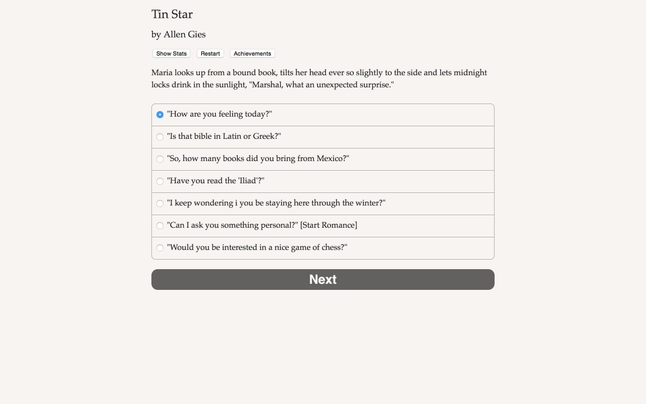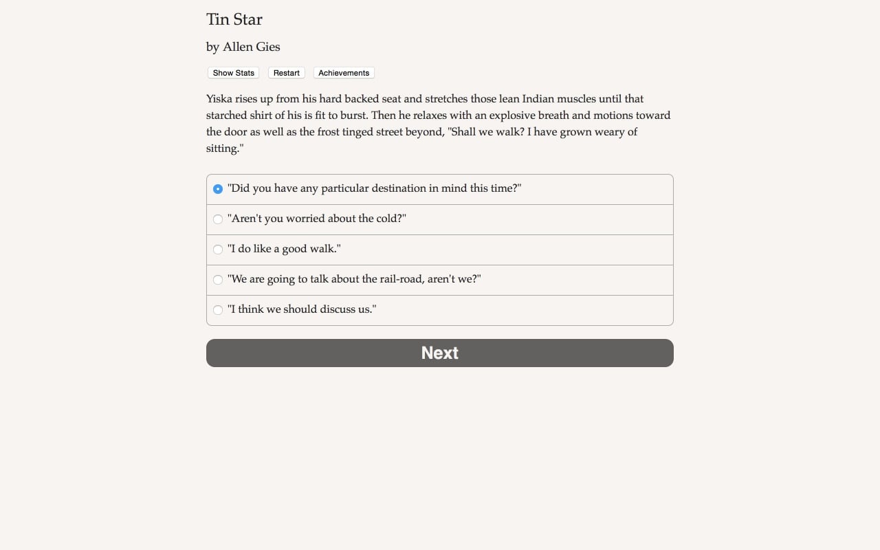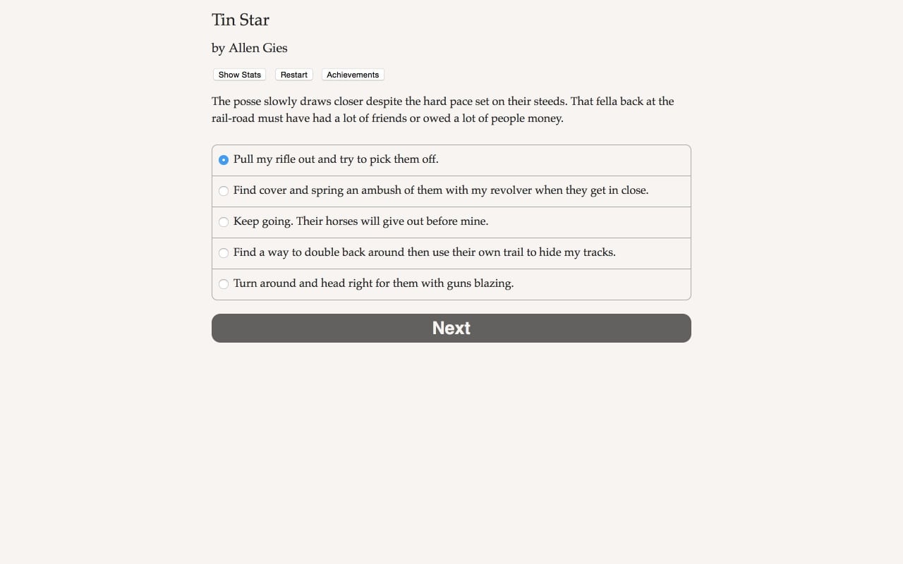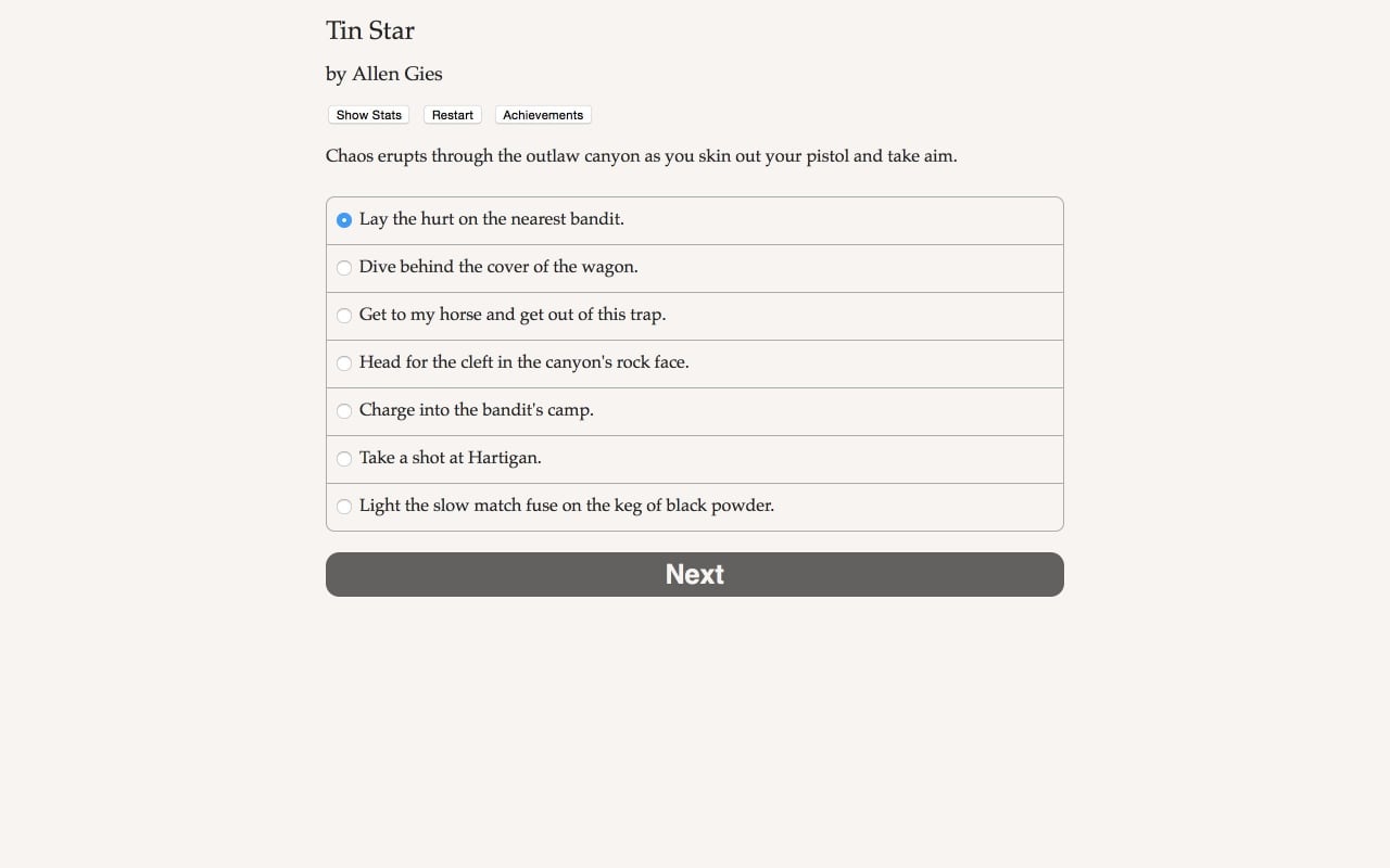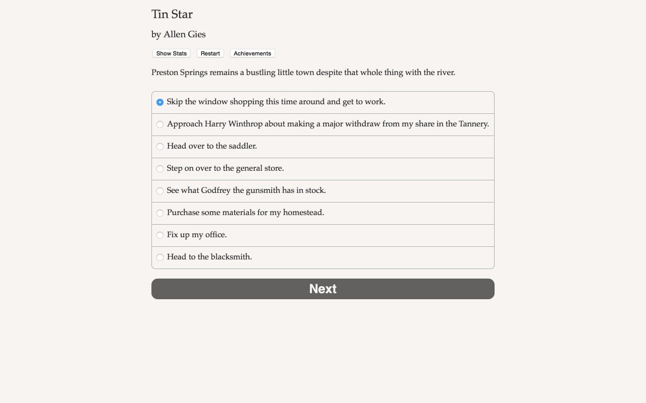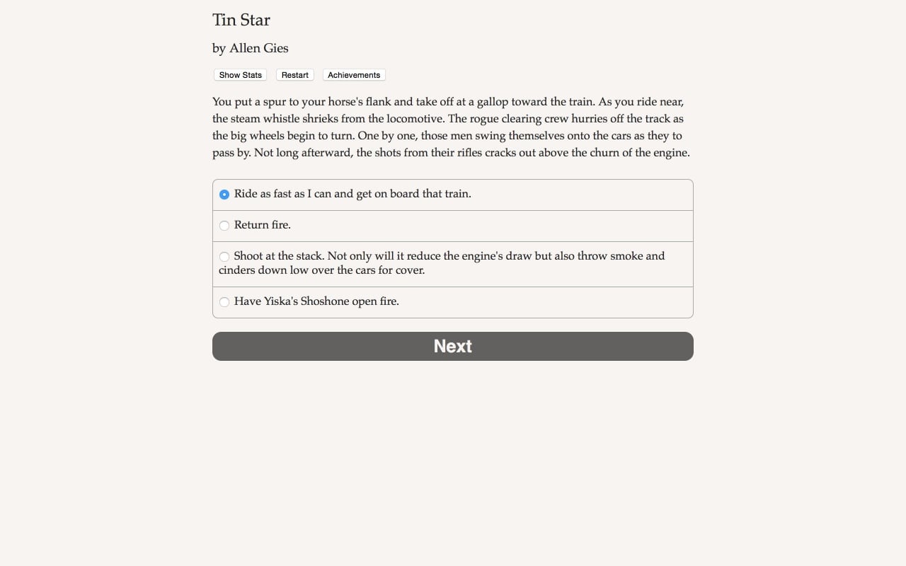 Tin Star является текстовой ролевой игрой с большим количеством выборов, которые повлияют на дальнейший процесс. Это интерактивный детективный роман, а сюжет будет разворачивать только исходя из действия пользователя. Здесь нет графики, звуковых эффектов, видеороликов и прочего. Картинка будет основываться на неудержимой силе воображения геймера. В проект включено свыше миллиона разнообразных слов и десятки тысяч предложений.