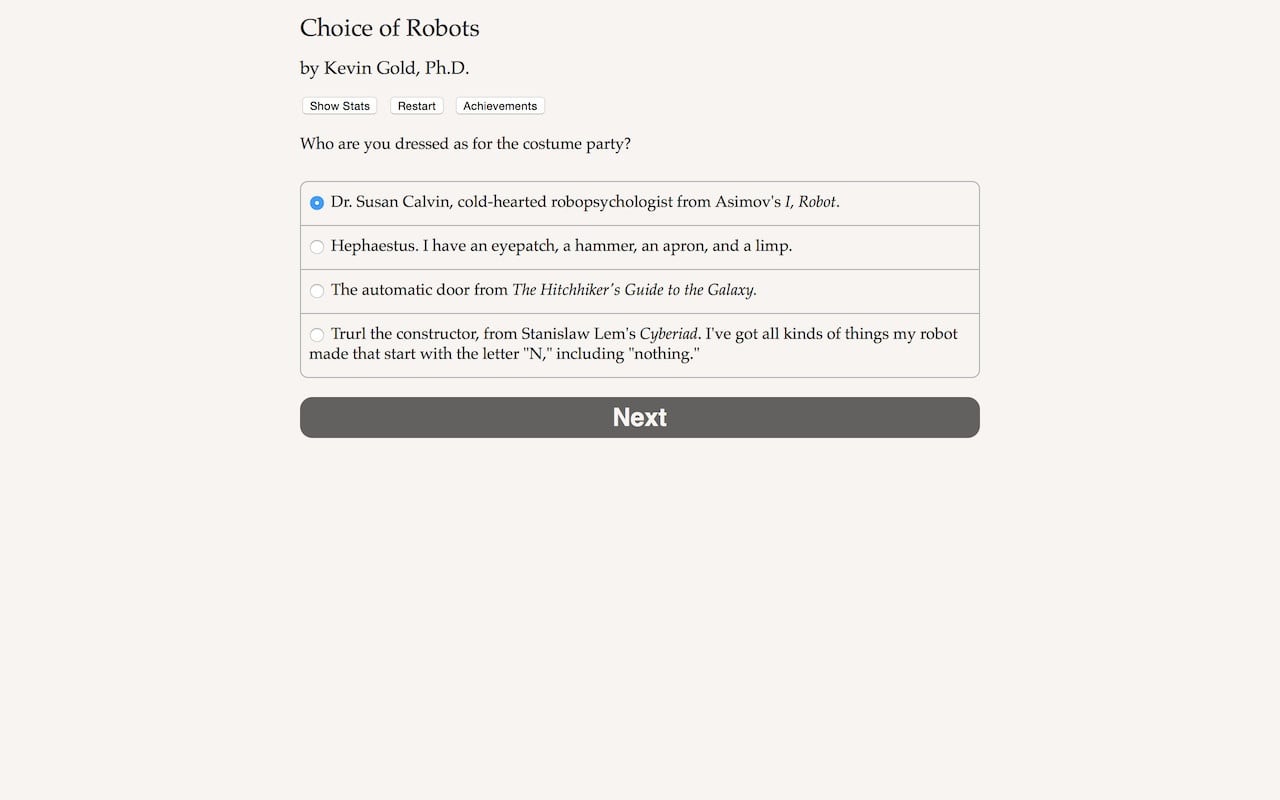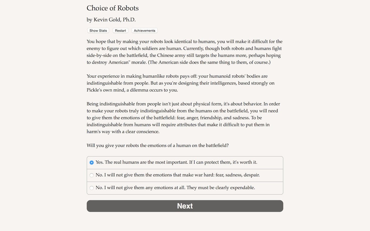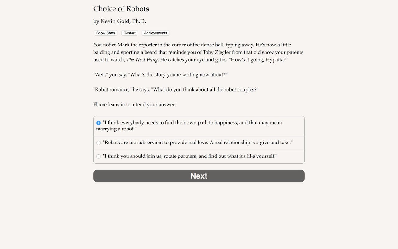 В ролевой текстовой игре Choice of Robots вам предстоит создать общество роботов, способных изменить весь мир. Дальнейшая судьба континента зависит только от ваших действий и выборов, завоюете ли вы Аляску или покажете истинный смысл любви остальной планете. Геймплей представлен в виде эпического интерактивного научно-фантастическому романа Кевина Голда.