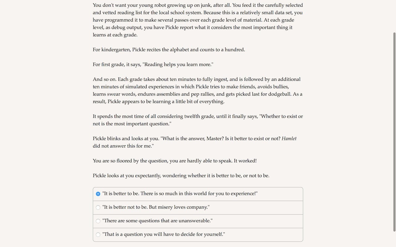 Всего в процессе включено около 300 000 слов и десятки тысяч предложений, по которым и будет разворачиваться сюжет. Здесь нет графики, звуковых эффектов, а картинка будет основываться только на силе вашего воображения. Перед началом прохождения понадобится создать уникального робота-персонажа. Выбирайте его формы, телосложение, характеристики и то, как он будет называть вас. Ваша задача – спровоцировать или предотвратить восстание роботов, обучая подопечных любить человечество или презирать его.