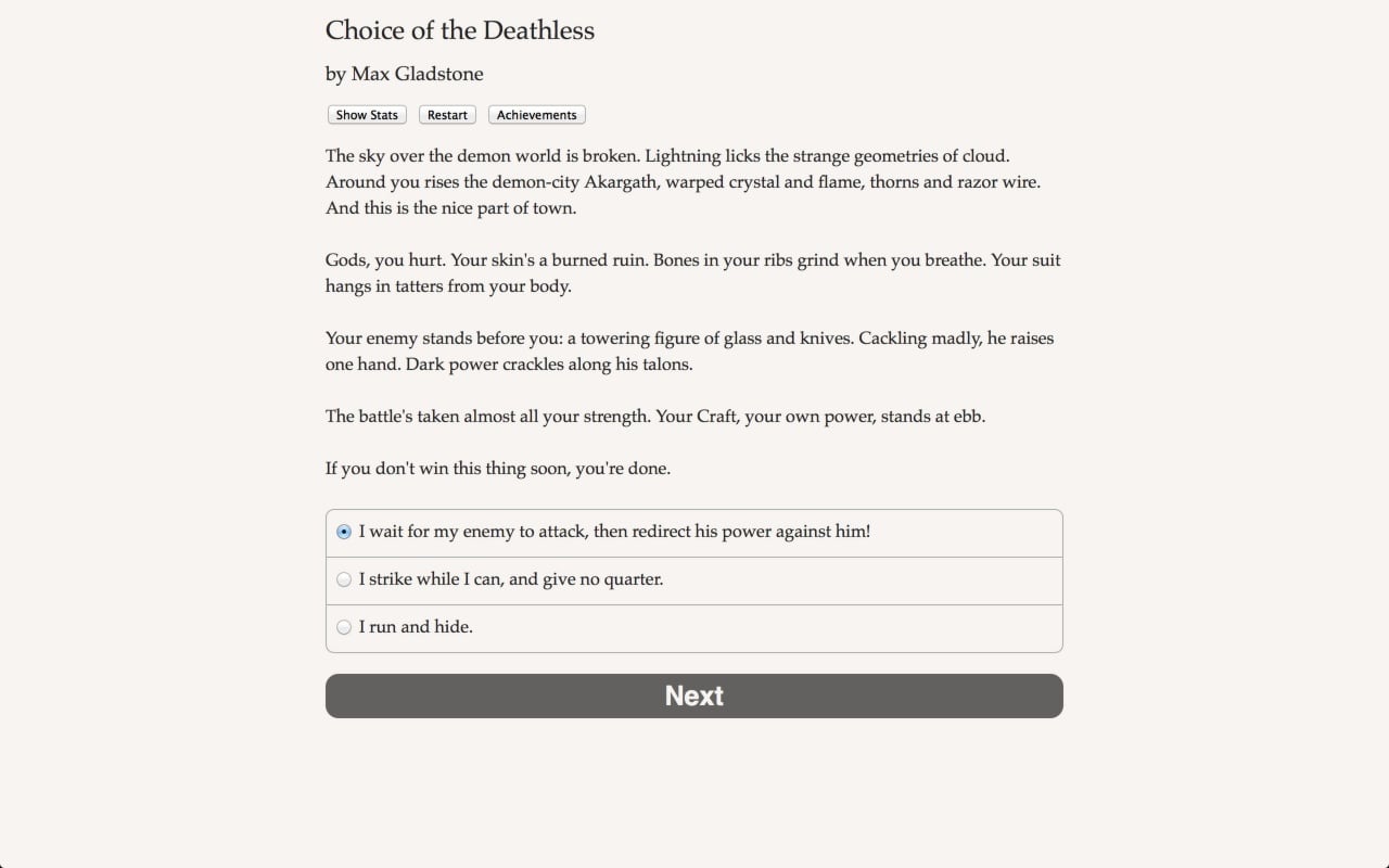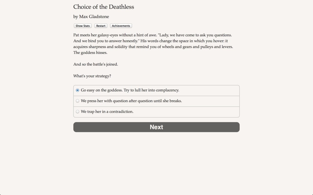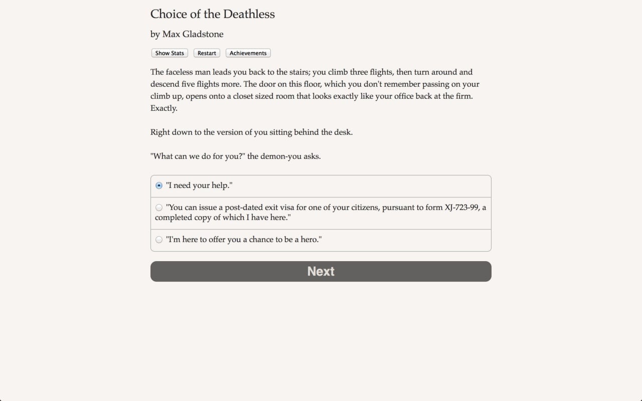 Choice of the Deathless относится к жанру CYOA (Choose Your Own Adventure). Иными словами, это текстовая адвенчура с элементами ролевой игры. В ней нет графики и звука. Вся информация подается только с помощью букв. Геймплей состоит из чтения больших объемов текста и совершения выбора (реплики или действия). По сути, это интерактивная книга.