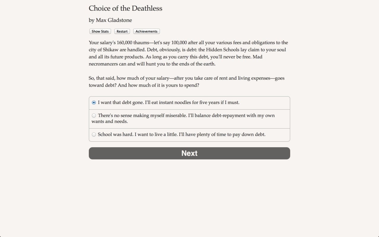 За сюжет отвечал американский писатель-фантаст Макс Глэдстоун. Перед началом можно создать собственного персонажа, придумав для него имя, выбрав пол и ориентацию, а также определившись с его прошлым, начиная с детства. Завязка в Choice of the Deathless начинается с гибели главного героя. Протагонист оказывается в загробном мире, где вместо денег используются души. Вскоре он узнает, что должен немалую сумму своему колледжу.