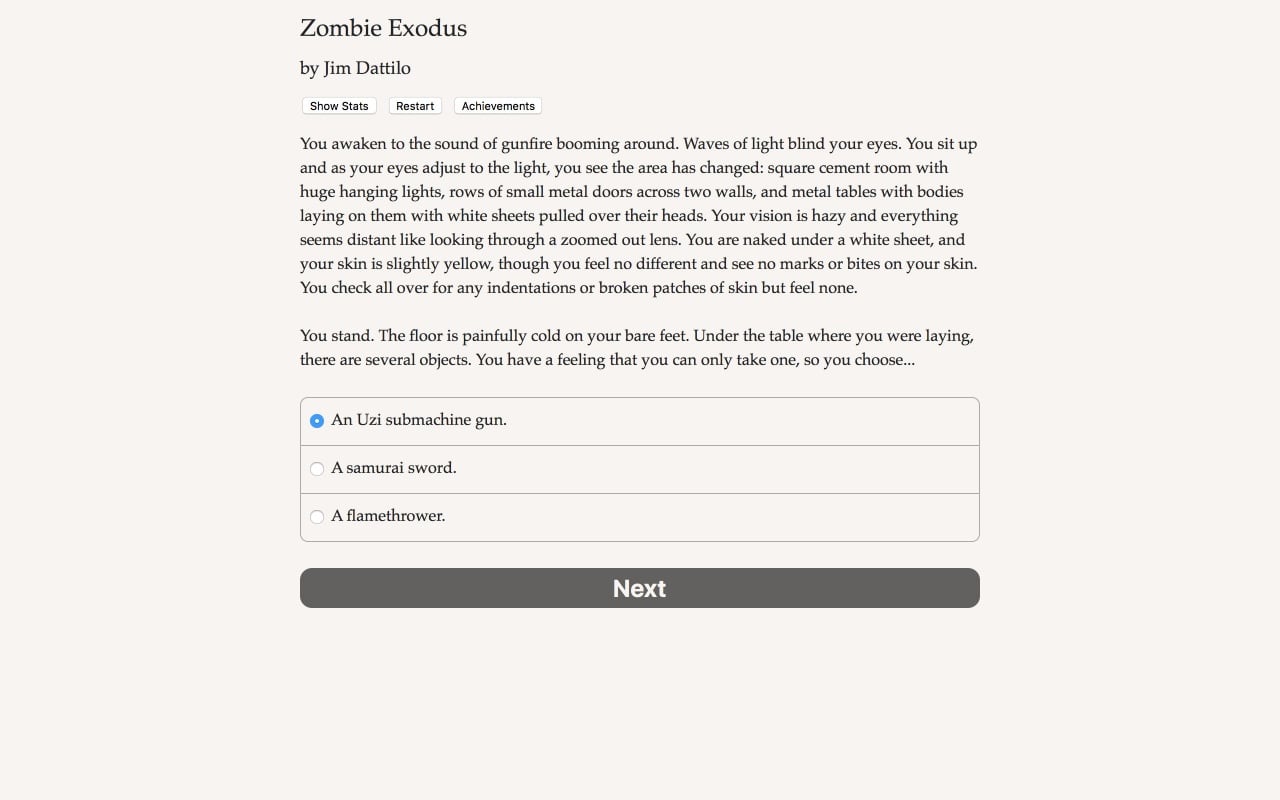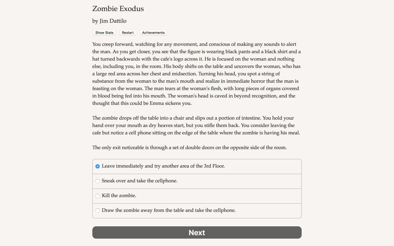 Zombie Exodus - текстовое приключение начинается с того момента, когда вы пытаетесь сбежать из обреченного города. Улицы охвачены зомби-эпидемией и вам потребуется совершить непростое путешествие через весь мегаполис, чтобы сбежать из этого кошмара. Игра представляет собой настоящий интерактивный роман за авторством Джима Даттило.