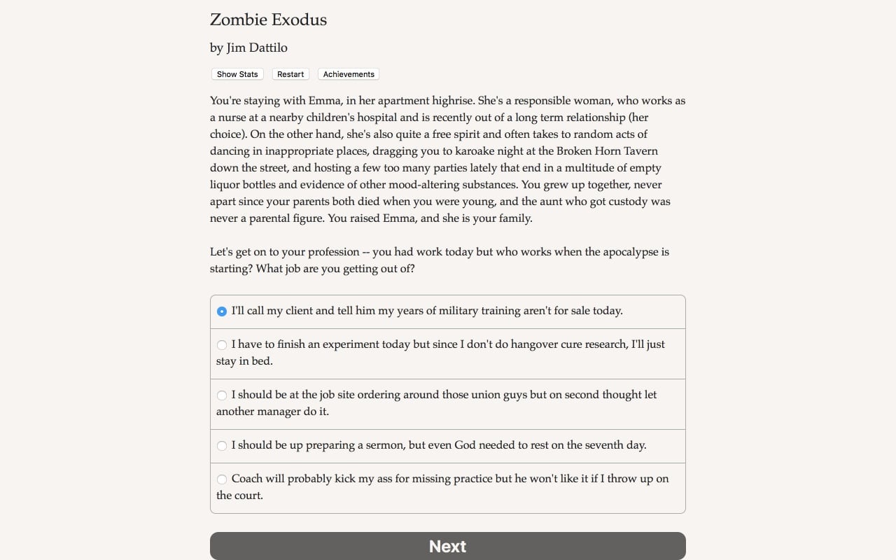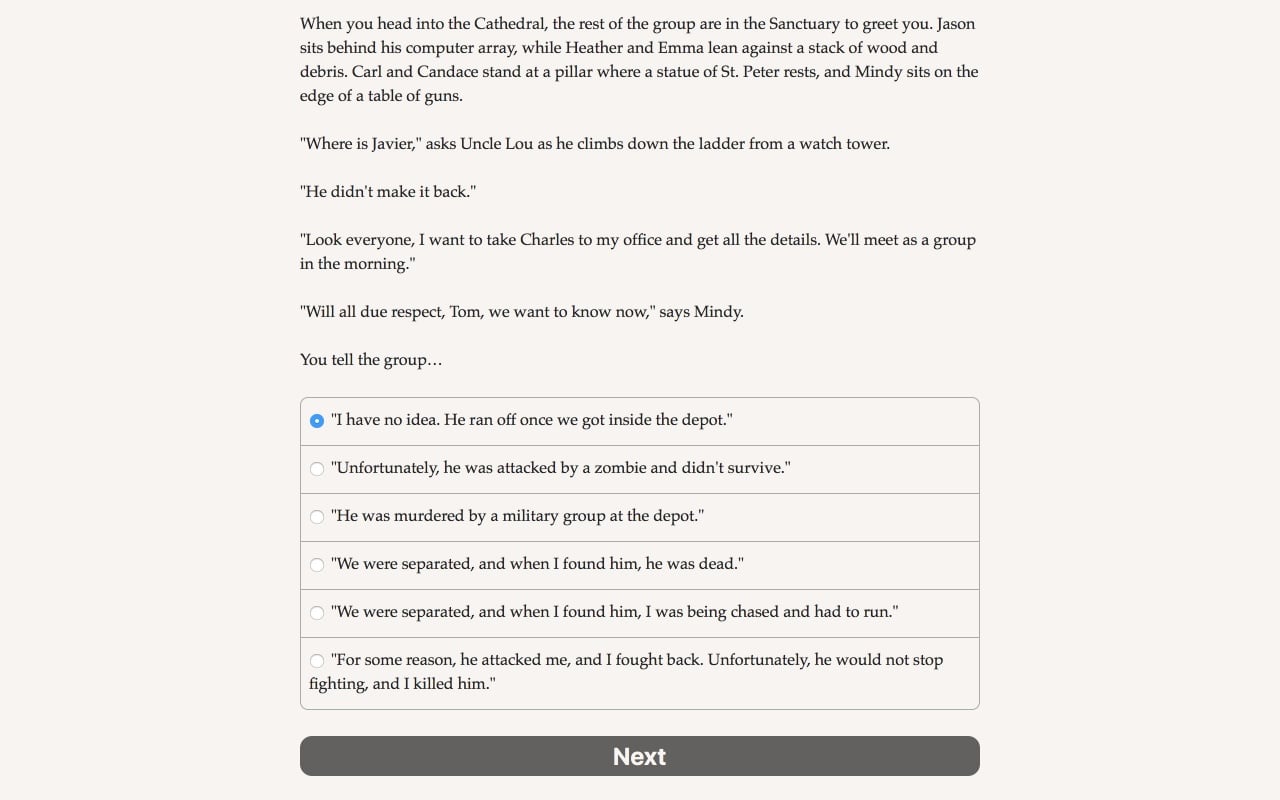 Вы словно читаете книгу, но при этом можете непосредственно влиять на развитие сюжета. Вам предстоит преодолевать препятствия, решать головоломки, исследовать город и убегать от орды монстров. Выбирайте профессию, среди которых солдат, спортсмен, плотник, министр и ученый. Доступен выбор пола и сексуальная ориентация. Это очень важно, поскольку вам предстоит много взаимодействовать с выжившими. Выбирайте кому доверять, а кто по вашему мнению окажется предателем. И да, кто знает, может даже получится найти свою любовь в том ужасном мире.