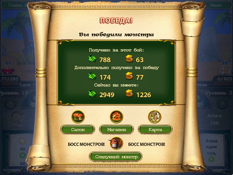 Игрокам доступны различные комбинации во время сражений, где нужно подбирать и продумывать цепочки длинных комбинаций и вариантов, для максимального результата, очищая и опуская элементы вниз. Главной задачей выступает полная зачистка поля или выполнение необходимой нормы, набирая очки, чтобы перейти к следующей локации и новым испытаниям. Процесс выполнен на экране, где видно схватку между героем и его противником, которые участвуют в бою.