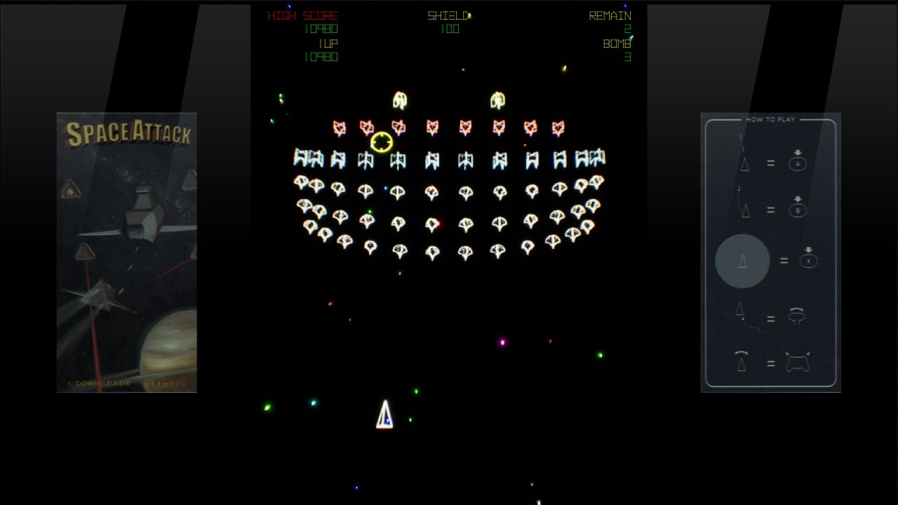 Space Attack является вертикальным скролл-шутером. Инди-проект стилизован под старые аркады из 1970-х. В игре использован вид сверху. Пользователи управляют звездолетом под названием "Архимед". На судно можно установить один из 3 типов оружия (новое вооружение при этом заменит текущее). Первое выпускает очередь из проджектайлов, которые соперники не могут уничтожить. Второе метает на дальние расстояния снаряды, что уязвимы для вражеских пуль. А третье проводит атаки по широкой области, уничтожая в верхней части экрана самих супостатов и их проджектайлы. Арсенал становится доступным по мере прохождения. Первые две пушки можно прокачать по 5 раз.