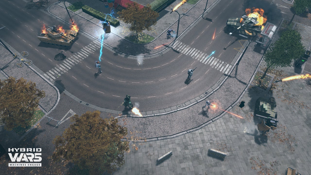 В игре Гибридные войны противники хорошо вооружены, в их арсенале есть сдвоенные ракеты, рельсотронные пушки и другое мощное оружие. Пользователь может попробовать одолеть недругов голыми руками или пересесть за руль боевой машины. Геймер получает 4 типа бронетехники: робота, титана, вертолет и танк. Каждую модель можно улучшать, увеличивая показатель здоровья и боезапас вооружения. У техники есть основной и альтернативный режимы огня. Сражения получаются зрелищными, потому что все элементы окружения разрушаемы. Во время битвы уничтожаются стены, здания, башни и корабли.