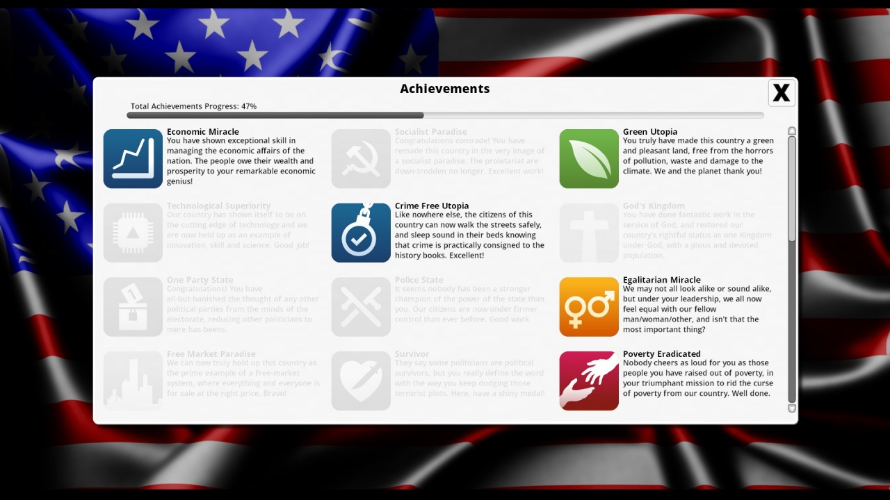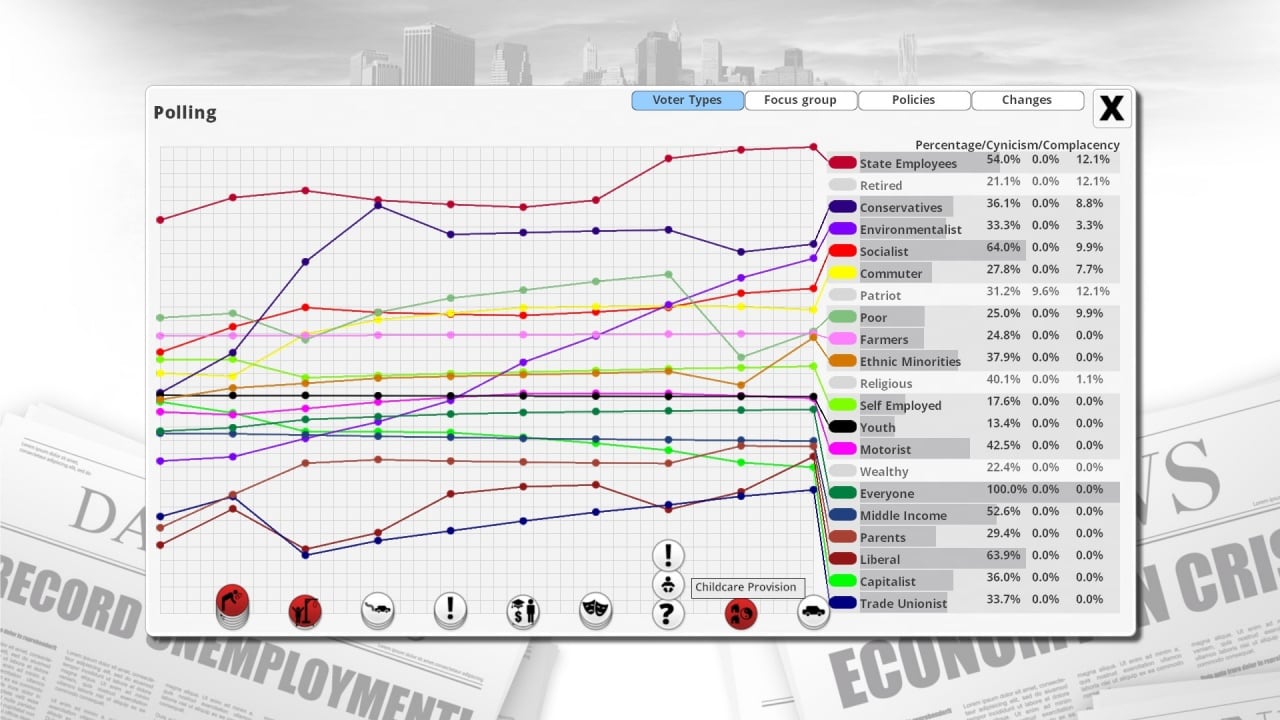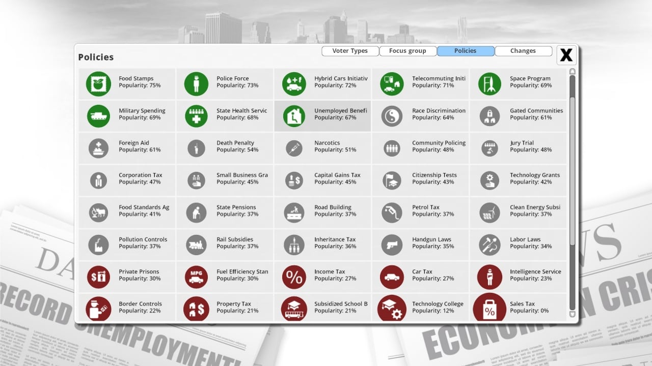 Доступно ведение 7 политик своего государства – общественных, правовых, транспортных, обеспечительных, экономических, налоговых и внешних. Нужно постоянно балансировать на краю пропасти, не забывая ни про одну сферу жизни будущих избирателей. Их мнение очень важно, ведь целью есть переизбрание на следующих президентских или парламентских выборах. Если электорат будет недоволен вашим правлением, вы уступите другому кандидату, что приведёт к концу прохождения.