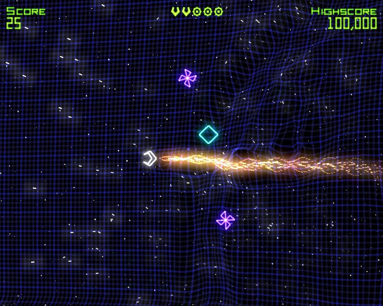 К примеру, grunt нападают сразу, spinner после уничтожения оставляет маленькие копии, gravity well засасывают все вокруг и т.д. Уничтожайте всех на своем пути и превратите экран в настоящий парад эффектов и звуков! Каждые 10 000 позволяют произвести автоматический апгрейд пушки, 75 000 награждают дополнительной жизнью, а за 100 000 очков выдается мощная бомба, которая может уничтожать всех на экране.