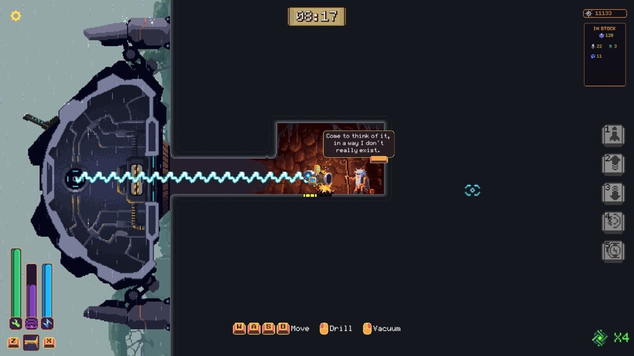 Пользователю предоставлен богатый арсенал оружия. Ему доступны самонаводящиеся ракеты, пулемёты и другие пушки. Разнообразие среди чудищ тоже присутствует. С ними можно сражаться на ходу. Со временем начинают прилетать все более сильные супостаты, поэтому робо-паука следует постоянно улучшать. Экзокостюм его пилота тоже надо часто апгрейдить, чтобы тот мог раскалывать наиболее твердые породы. Мир Стены – это имя видеоигры и название измерения, в котором разворачиваются показанные в ней события. Игроку предстоит раскрыть тайны этого места и отыскать следы неких "других". Локации генерируются каждый раз случайным образом. Карта состоит из разнообразных биомов. По мере прохождения открывается доступ к новой местности.