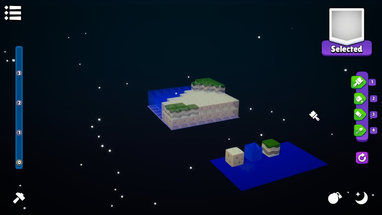 Пользователи смогут видоизменять окружающую местность и фоновые изображения, меняя цвет или текстуру (космос, звездное небо и т.п.). На локациях предстоит генерировать различные симметрические или хаотичные сцены, состоящие из кубических компонентов. Геймеры будут собирать по отдельным кубам желаемые композиции. Выйдет размещать водные, земляные, травянистые, каменные и прочие виды блоков, чтобы создать собственный "Милый островок".