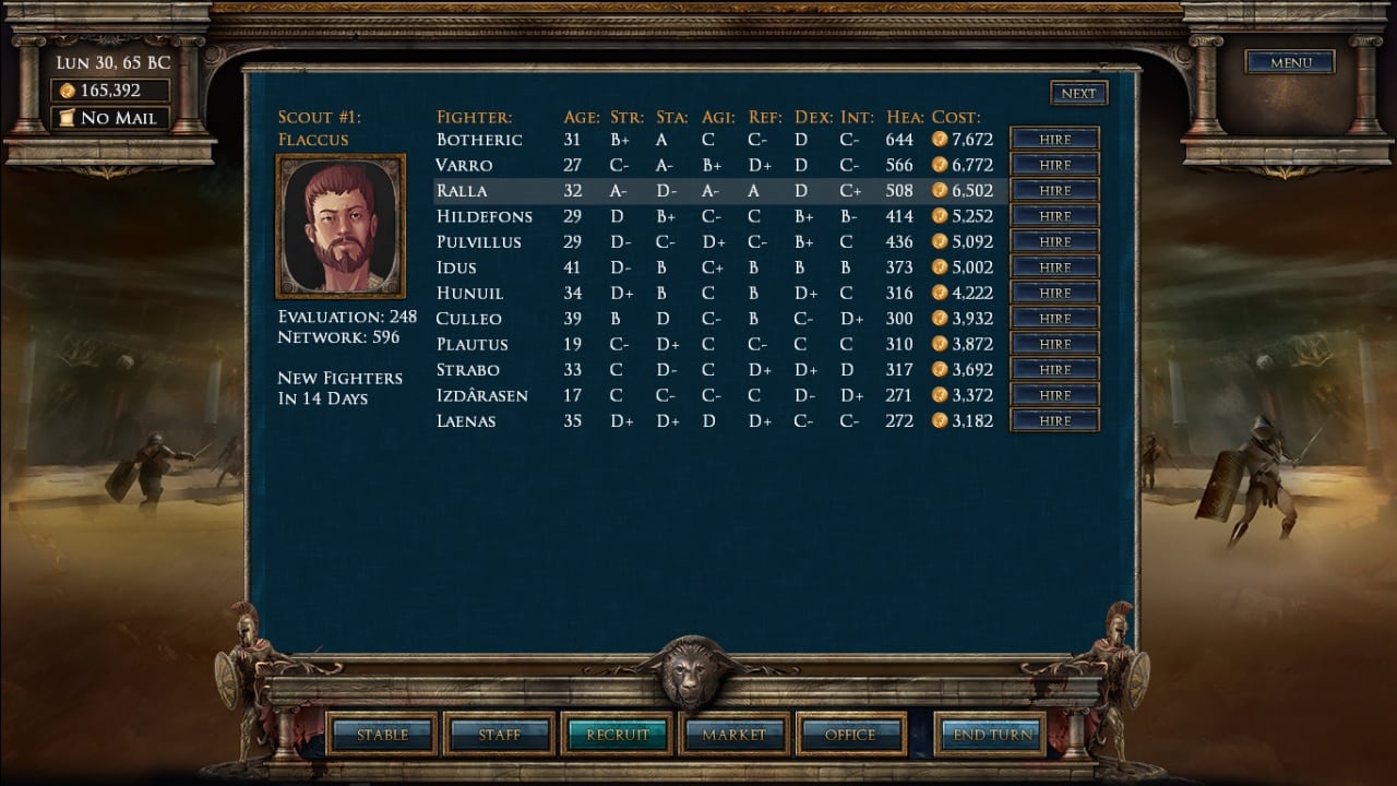 Первоначально нам будет предоставлена небольшая денежная сумма и полное отсутствие воинов. Выберите воинов и совершите первый взнос, всё это делается для начала боёв на арене. Вы должны учитывать травмы, настроение и силу бойца, ведь от этого может зависеть исход сражения. В магазине всегда можно приобрести аптечки, всевозможное оружие и экипировку, чтобы усилить подопечного. Каждую потребность своего подопечного нужно незамедлительно удовлетворять.