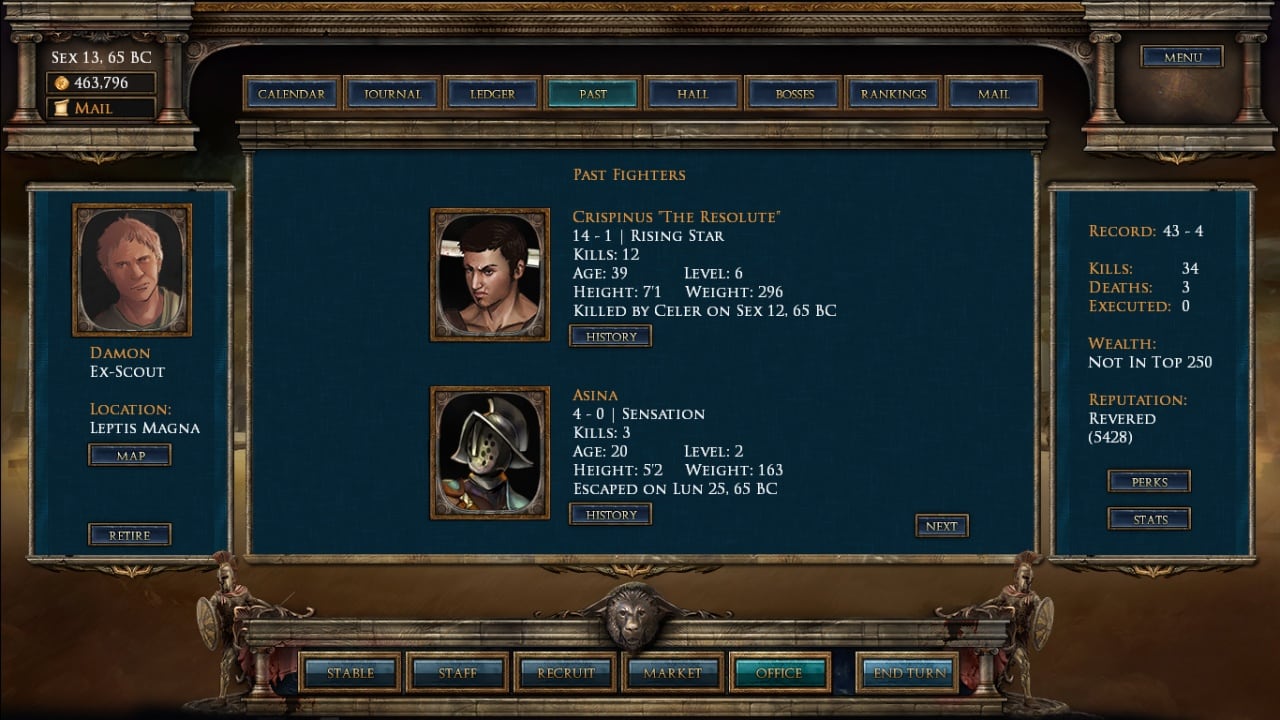 В игре есть экономическая система, предоставляющая ресурсы, которые необходимо вкладывать в развитие юнитов. Каждому из них требуется еда, вода и одежда, а главное оружие. Можно повысить свою репутацию, тем самым привлечь более сильных воинов. Каждый бой гладиатора заканчивается либо победой, либо поражением. Проигрыш – это смерть юнита, а выигрыш повышает характеристики, даёт славу и деньги.