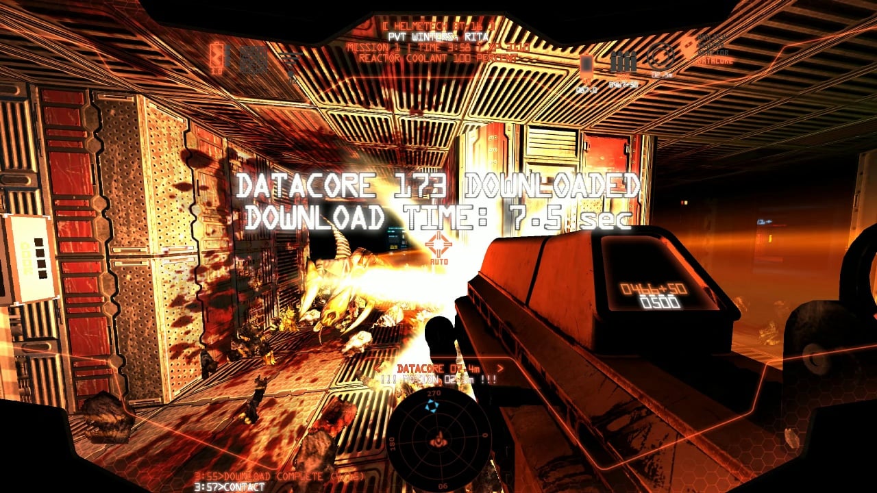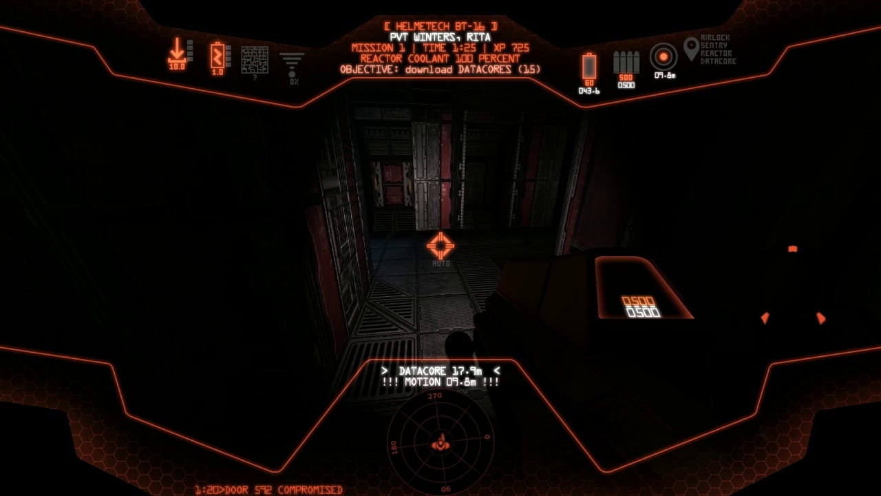 В Space Beast Terror Fright используется концепция процедурной генерации уровней. Помещения корабля представляют собой коридоры, которые постоянно переплетаются и переходят друг в друга, чтобы запутать пользователей. Здесь вырисовывается еще одна проблема - отсутствие постоянного источника света. На оружии имеется фонарик, но даже с учетом этого уровень обзора сильно ограничен. На экране отображаются все необходимые данные, включая текущую цель, заряд фонаря, а также уровень энергии. Загрузка данных происходит через специальные терминалы, которые хаотично разбросаны на уровне. Когда геймеры нажимают на клавишу взаимодействия, на терминале появляется оповещение, а также статус загрузки. Но это не значит, что дело сделано, и достаточно дождаться окончания загрузки.