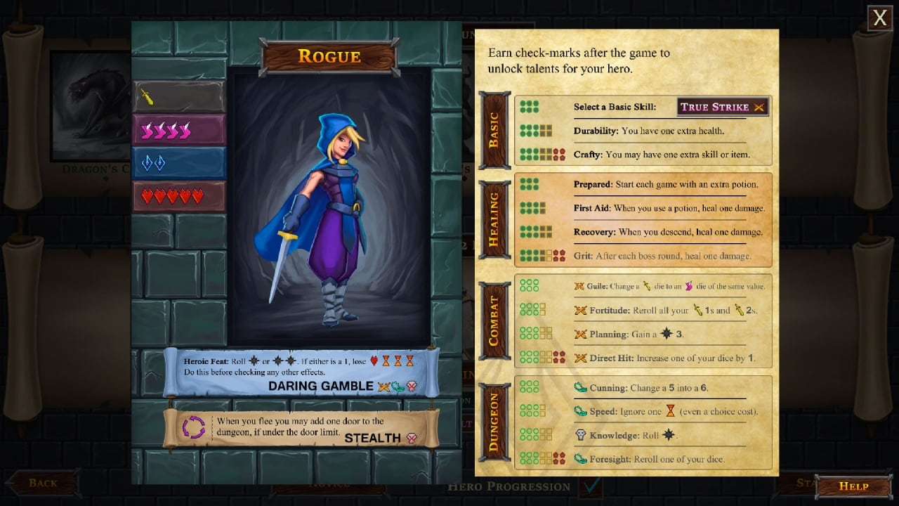 В бою в Ван Дэк Данжен получится опробовать следующих протагонистов: Маг (атакует при помощи заклинаний), Воин (дерется ближнебойным оружием), Разбойник (полагается на хитрость и обман), Лучник (расстреливает врагов на расстоянии), Паладин (обладает защитными бафами), Туман (волшебник, что перешел из мира Конца Эона для спасения Минервы). Геймеры смогут разблокировать 15 уникальных навыков, которые помогут в сражениях. В проекте предстоит пройти 5 испытаний: Пещера Дракона, Логово Йети, Риф Гидры, Лабиринт Минотавра и Могила Лича.