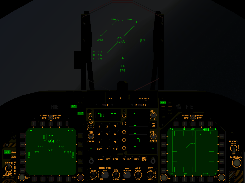 Интерфейс в F/A-18 Precision Strike Fighter устроен таким образом, чтобы пользователи могли получать доступ ко всей необходимой информации. За каждой клавишей и рычагом, который находится в кабине, закреплена клавиша на клавиатуре, но при желании можно использовать мышку, кликая на нужный прибор. Там также расположен спидометр, показатель давления за бортом, углы наклона корпуса и прочие важные показатели, за которыми нужно следить во время полета. При этом, камера не привязана к какой-то оси, поэтому можно производить полноценный обзор территории, выводя ракурс за пределы кабины, осматривая сушу и пространство впереди себя. При этом, куда бы не посмотрел игрок, он постоянно будет видеть перед собой прицел и систему наведения. И если в поле зрения появится потенциальная цель, можно будет сразу же выпустить по ней ракеты или открыть огонь из пулеметов.