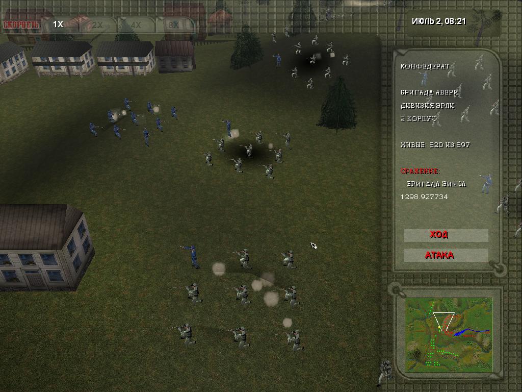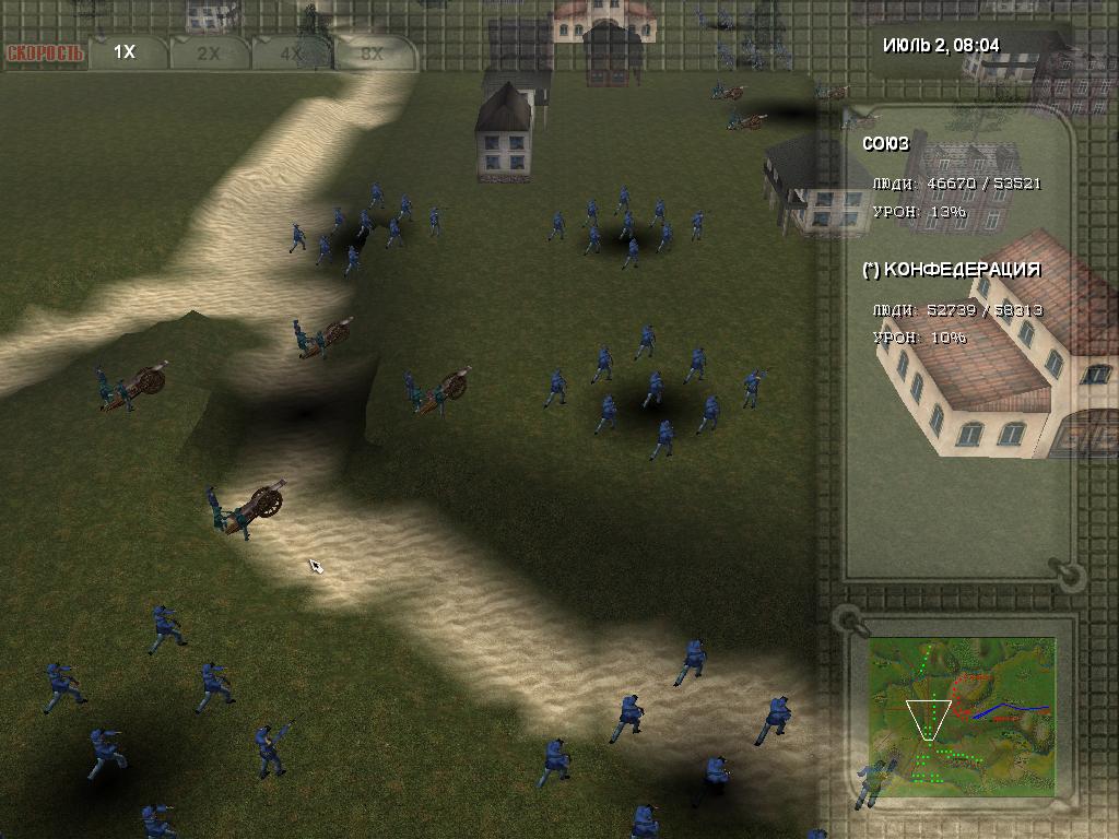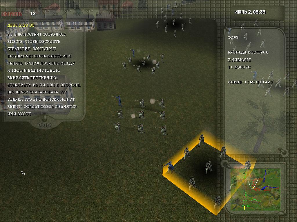 Геймплей в Gettysburg 1863 завязан, в том числе на грамотном использовании ресурсов. Так, камень, дерево, золото и другие материалы понадобятся для создания укреплений, административных зданий, укрытий и других объектов. Так, достаточно выбрать тип строения и обозначить участок карты, после чего работяги сразу приступят к работе. Что касается контроля боевых построений, то они осуществляются по тому же принципу. Конница, пехота или артиллерийские формирования - их все можно перемещать по доступным участкам карты, создавая удобный для атаки боевой порядок. Например, если враг хочет напасть на укрепления в лоб, можно рассредоточиться по периметру, чтобы в момент столкновения окружить его плотным кольцом. Стоит понимать, что масштабы карты здесь довольно внушительные, и для удобства переключения камеры достаточно просто кликнуть на мини-карту, после чего отдать приказ войскам двигаться в ту точку.