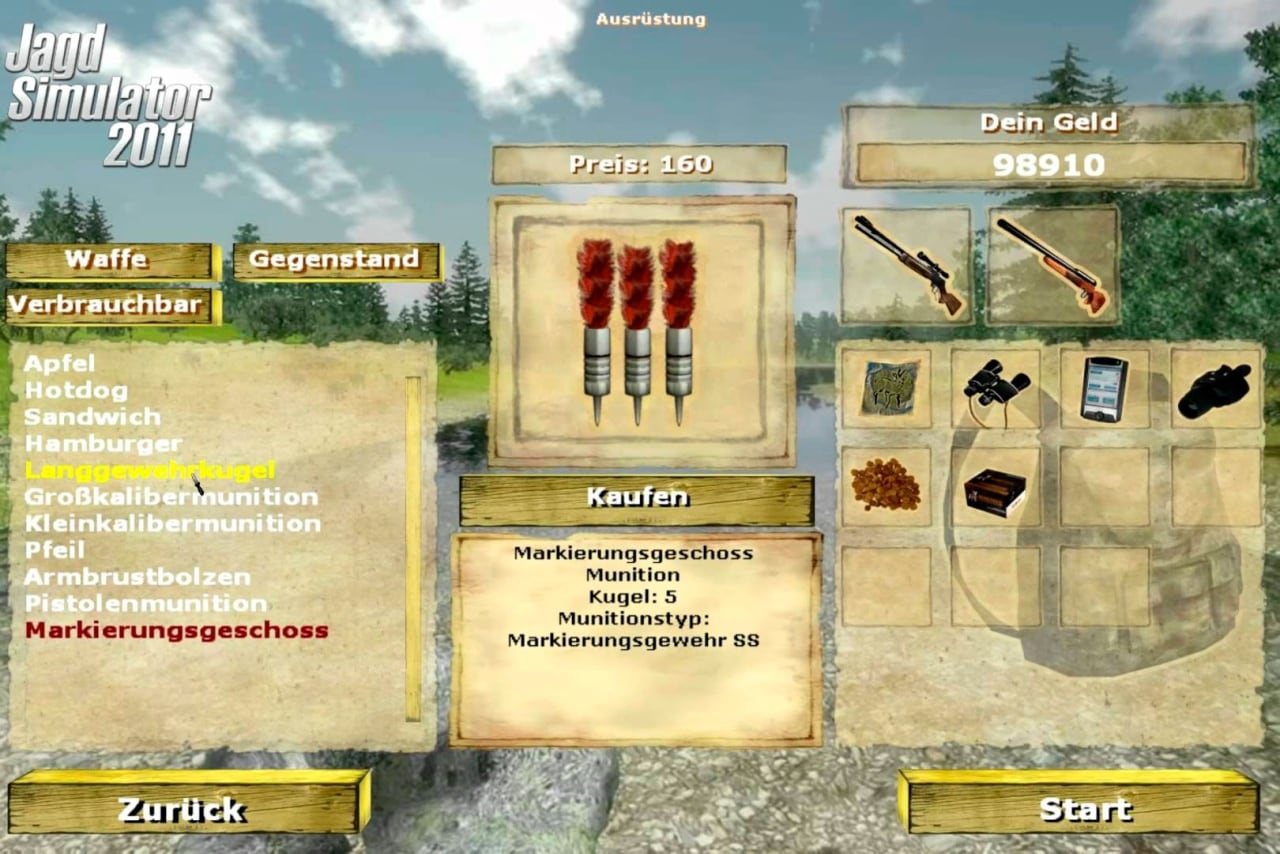 3Д Джагд Симулятор 2011 может похвастаться довольно обширным арсеналом огнестрельного оружия, а также вспомогательных средств. Приобретать их можно за счет найденных трупов убитых животных, ведь нередко подстреленный зверь убегает и уже после погибает от кровотечения. Проследить за ним можно по характерному кровавому следу, который будет тянуться от места попадания до смерти.