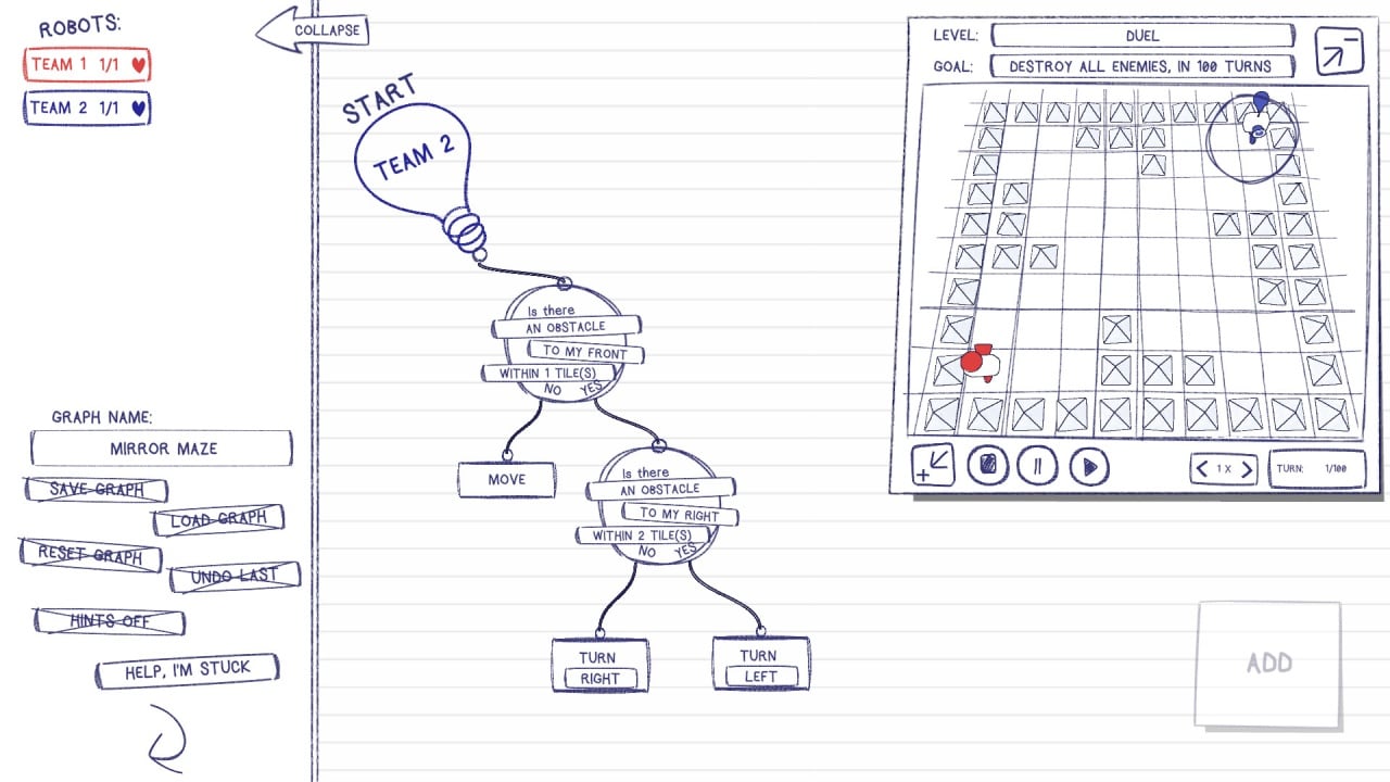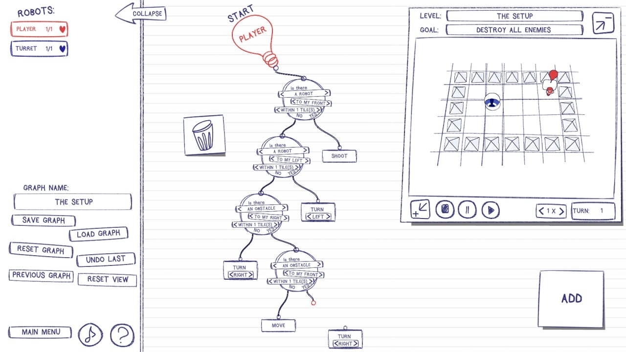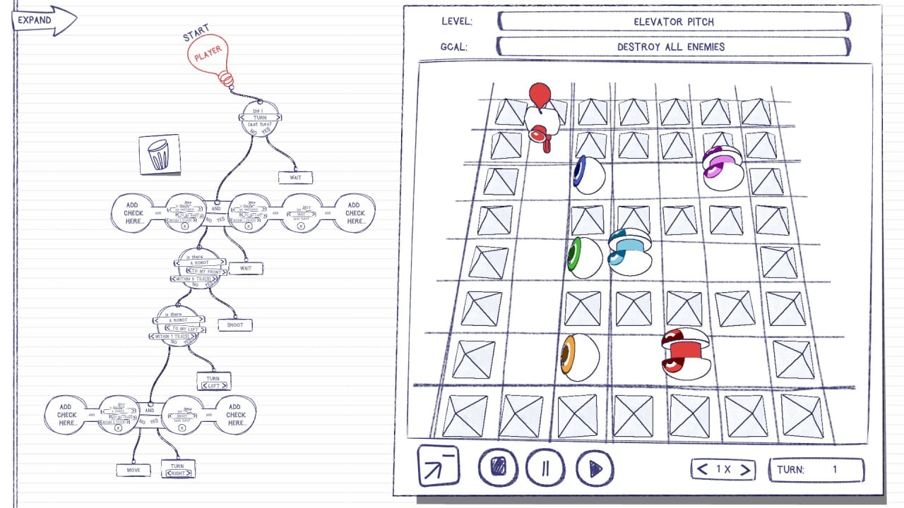 Оттачивать навыки программирования в Sketchbots приходится на рисованном блокноте, где пользователи смогут создавать желаемые комбинации из серии действий, основанных на использовании узлов. При помощи связок из нескольких фрагментов, можно направлять в необходимое место робота. Главной задачей для геймера станет решение головоломок на бумажном листике, где комплексные соединения и комбинации выполнены в виде нарисованных объектов.