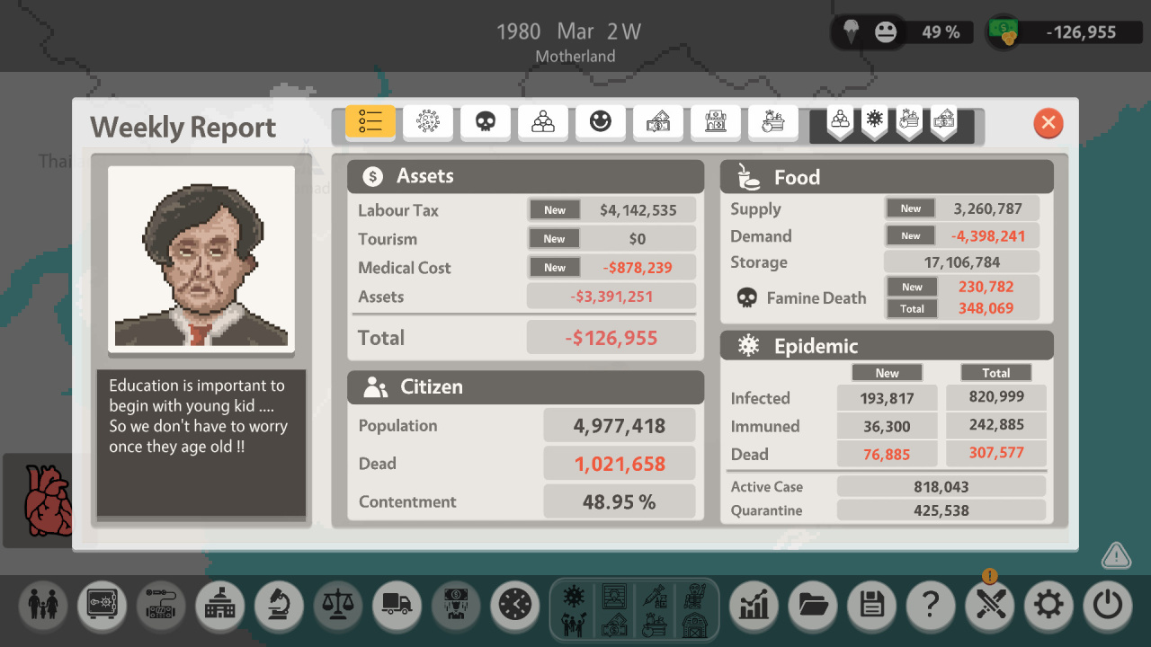 Геймерам в Карантинер придется заниматься строительством больниц, улучшением инфраструктуры и распределением обязанностей, которые должны выполнять рабочие. Приходится отслеживать за новыми инфицированными и изолировать их от остального общества, стараясь остановить распространение болезни. Игроки смогут нанимать ученых и врачей, чтобы проводить исследования и анализ природы вируса, стараясь отыскать средства для лечения. Для влияния на общество, предстоит применять хитрые уловки при помощи СМИ или менять экономику государства.