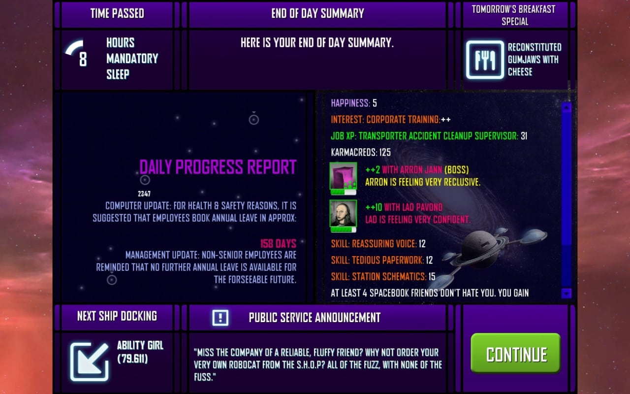 Геймплейные механики представлены в виде интуитивно понятных действий, где игроки будут выбирать среди заготовленных вариантов желаемые пункты. Предстоит наблюдать за короткими историями, что демонстрируют клишированные жизненные ситуации, которые обыгрываются через призму космических приключений в далеком будущем. Рассказ подается в форме обновлений статуса и сообщений, погружая в пошаговый симулятор.