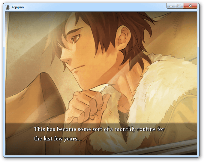 Визуальная новелла Agapan погружает геймеров в жизнь молодого паренька, который страдает от одиночества и не может отыскать свое место в этой жизни. В прошлом, юноша потерял семью и теперь проживает с другими людьми, что приютили его и воспитали. Героя мучают воспоминания, и он не может оказывать никакого сопротивления тяжелой психологической травме, произошедшей в глубоком детстве. Протагонист желает побольше узнать о погибших родителях, поэтому часто бродит по кладбищу и долго находится возле могилы своей матери, стараясь отыскать мистические знаки или подсказки, которые способны подкрасться в сознание молодого человека.