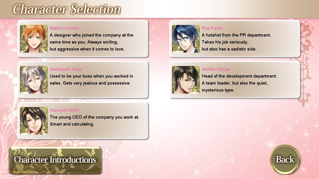 - Кунизу Махиро. Дизайнер, поступивший в компанию совместно с героиней новеллы. Улыбчив и немного агрессивен в любовных утехах.