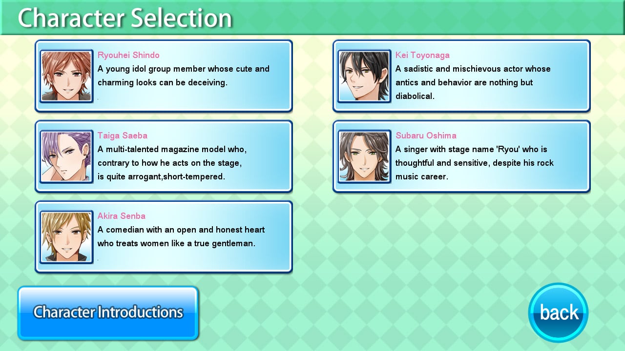 - Субару Ошима. Певец, которого знает множество фанаток. Создает рок-песни и выражает искренность эмоций в текстах, которые подпевают многие фанаты. Очень задумчивый и перенасыщенный похабной и испорченной индустрией.