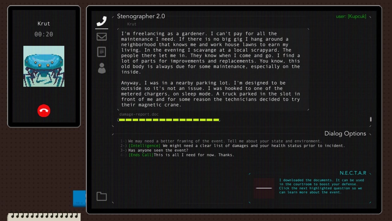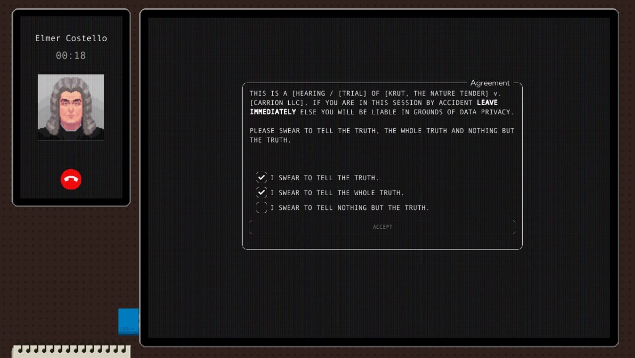 Протагонисту придется собирать информацию и общаться со свидетелями различных происходящих ситуаций, чтобы подготавливать документы для суда. Используя полученные доказательства и приводя верные аргументы, получится отстаивать права людей, пострадавших от вездесущего глаза государства и ставших жертвами жестокой бюрократии. Пользователи получают возможность бороться за права человека в узурпаторском и загнаивающемся обществе.