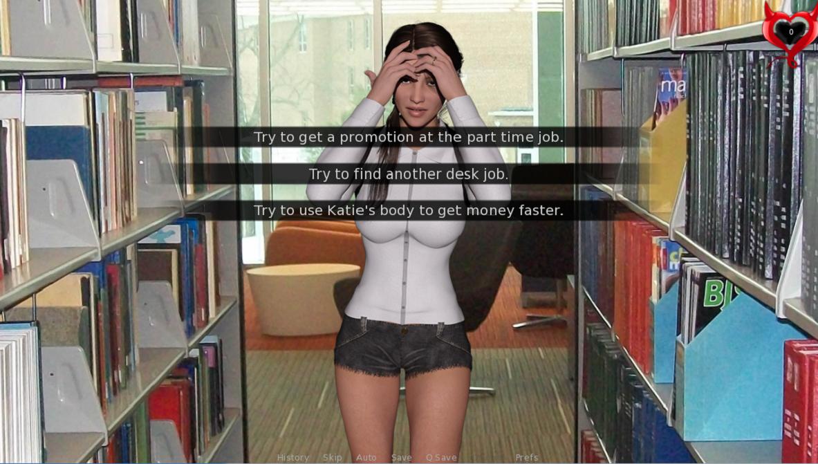 Визуальный роман Katie’s Corruption позволяет общаться близко с парнями, чтобы поднимать как можно больший доход. Главной задачей игрока в интерактивном рассказе, становится возможность влиять на происходящие с девушкой события, реагируя на ситуации или реплики других людей. Предпринимая выборы фраз в диалогах, получится направлять героиню, попутно соблазняя красивых и успешных мужчин, способных хорошо заплатить за услуги студентки. Протагонистка готова на многие вещи, которые контролирует пользователь. Предстоит решать, с кем лучше переспать и провести горячую ночь, учитывая социальные факторы или привлекательность самой личности. Предстоит выполнять требования, чтобы удовлетворять клиентов и получать от этого удовольствие. Придется научиться многим умениям, которые пригодятся в близком контакте, во время постельных сцен.