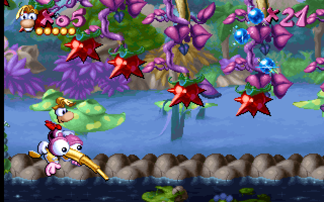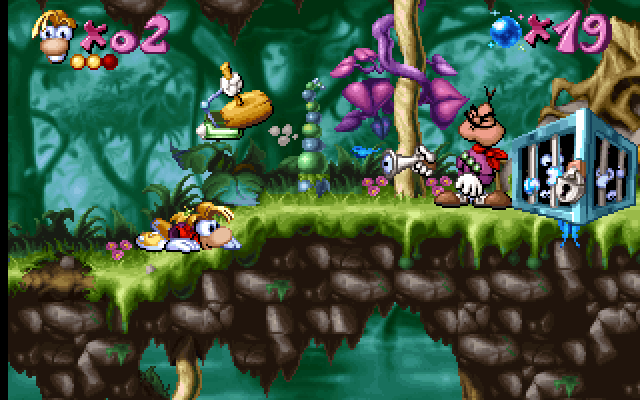 Рэйман – это не только название игры, но и имя главного персонажа. Герой выделяется нетипичным дизайном. У него есть руки и ноги, но конечности никак не соединены с туловищем. По мере прохождения он получает разные способности. Протагонист сможет превращать свои волосы в пропеллер, заметно ускоряться, применять телескопический удар, цепляться за уступы, рычаги и кольца. Некоторые умения он получает навсегда от феи Бетиллы. Остальные навыки ему дают ненадолго под конкретный уровень, а потом забирают после его прохождения.