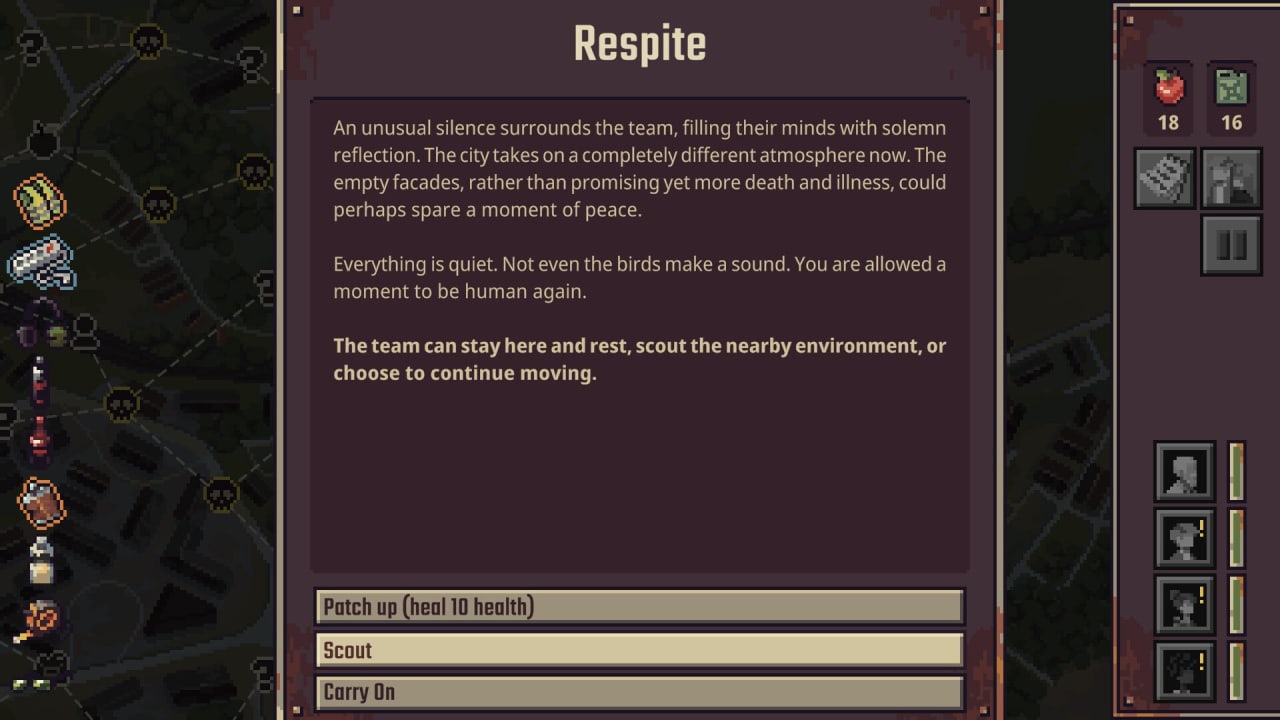 Соберите команду выживших и попытайтесь выбраться из этого ада. Принимайте решения относительно судьбы членов вашей команды по мере продвижения вперед. Персонажи будут общаться друг с другом, показывая положительные и отрицательные черты своего характера. Но не все команды доберутся до парома, но их истории важны. Сможете ли вы достичь цели, если мнения членов вашей команды различаются? Покиньте умирающий мир: исследуйте области в поисках убежища и припасов. Не забывайте о боях с зомби, ведь в игре более 15 типов врагов.