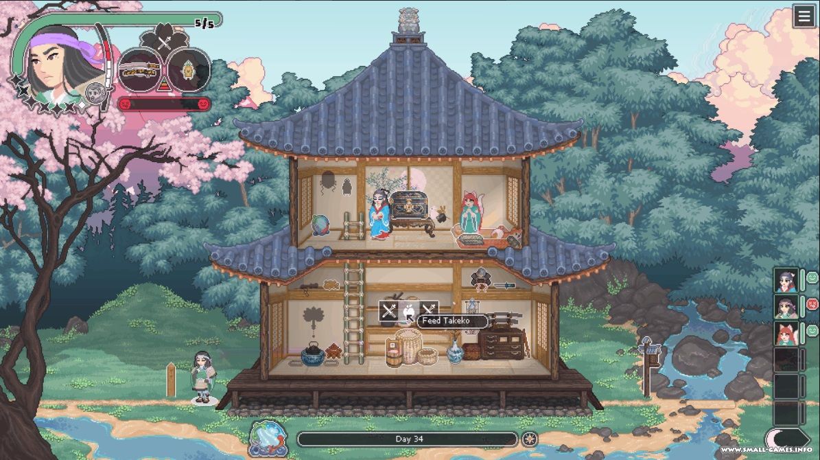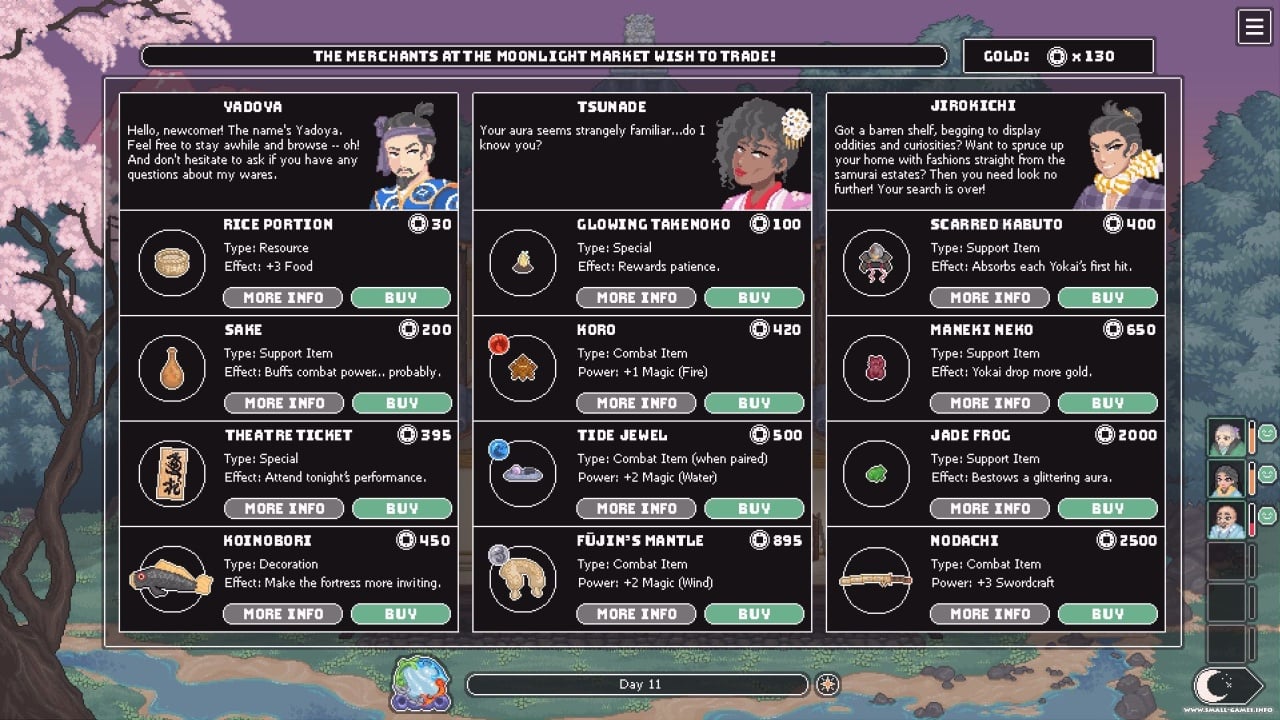 В дневное время необходимо сделать все возможное для подготовки к бою. Управляя местными жителями, требуется собирать ресурсы, укреплять здание, крафтить оружие и т.д. Грамотное руководство позволяет тщательно подготовиться к бою и придумать тактику защиты. На лунном рынке можно покупать ресурсы и различные улучшения. Всего доступно 20 уникальных жителей и порядка 100 случайных событий. Вместе со своими бойцами требуется пережить 6 полнолуний, после чего удастся устранить угрозу со стороны врагов.