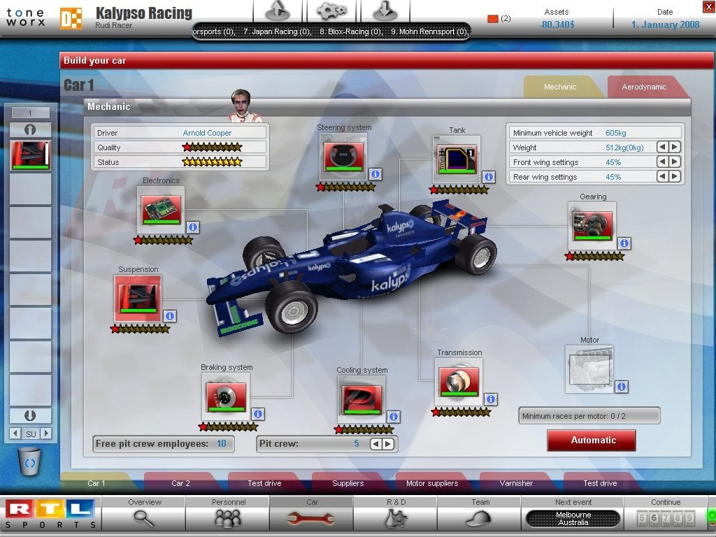 RTL Racing Team Manager дает четкое понимание того, что проекты, связанные с менеджментом, не могут быть простыми. В первую очередь из-за того, что пользователям придется контролировать сразу несколько важных процессов. Подбор исполнителей и заключение соглашений, поиск спонсоров, контроль расходов, проведение тестов новых болидов и прочие обязанности должны выполняться своевременно, чтобы команда развивалась в нужном направлении и не теряла позиции в рейтинге. К тому же, благодаря удобному главному меню, где для каждого раздела выделяется специальное окно. Например, можно сразу увидеть личный состав команды (технический директор, менеджер маркетинга, главный инженер и другие), а также их национальности. Кроме того, кликая на отдельные составные части, можно увидеть их стоимость, а также эффективность для конкретного авто. А когда комплект сформирован, можно провести тест, приняв участие в очередном заезде. При этом, в зависимости от формации трека система заранее определяет сложность гонки. При необходимости, можно менять пилотов и давать шанс новым талантам проявить себя в ответственных заездах.