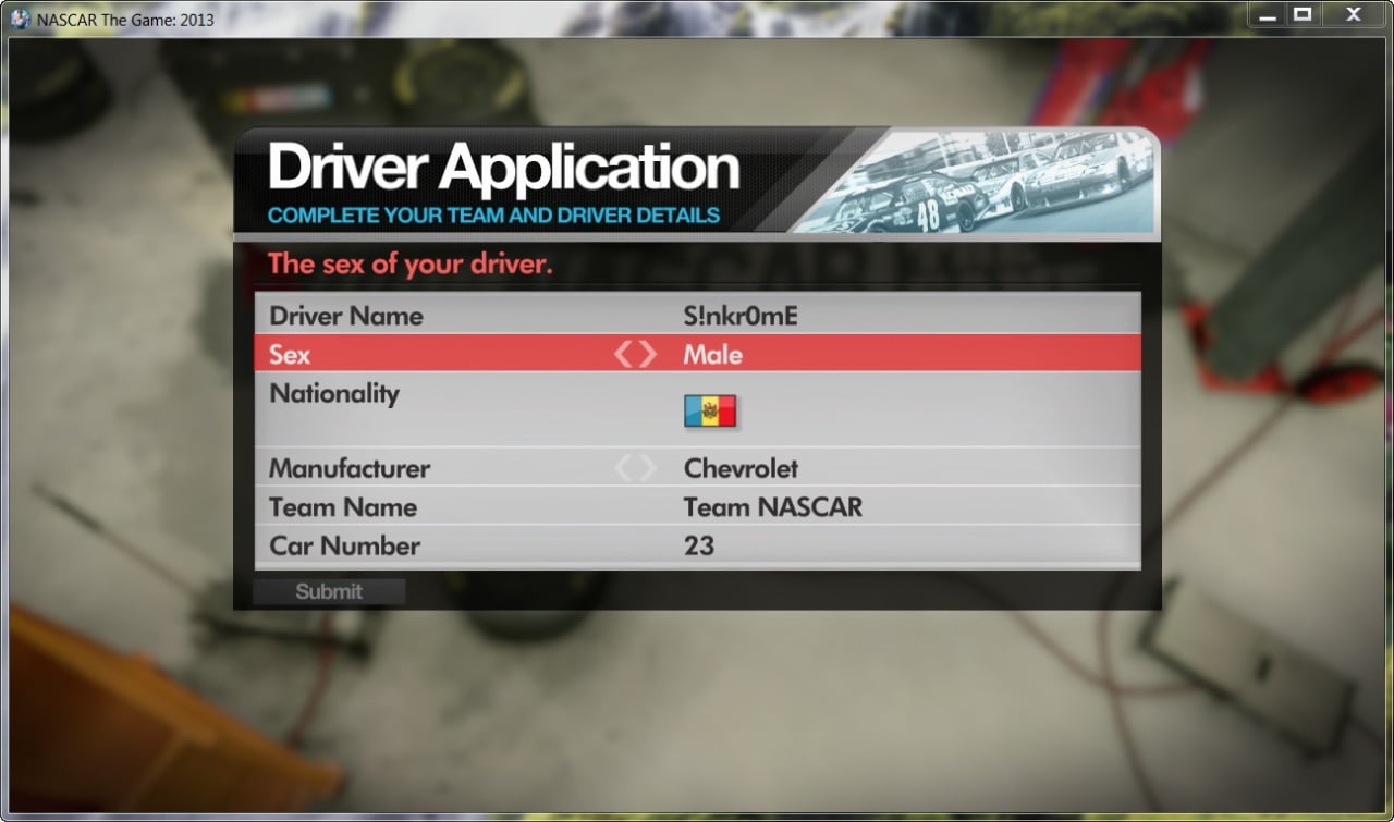Бороться за топ места в рейтинговой таблице NASCAR: The Game 2013 возможно на популярных машинах, которые доступны на выбор пользователю. В большом гараже представлены разношёрстные марки и бренды запчастей, которыми можно улучшить и прокачать кузов или внутреннюю начинку, чтобы достичь уверенного сцепления с трассой и быстрого старта. Игрок выбирает страну и протагониста, за которого отправляется на прохождение длинных дистанций и сложных маршрутов, требующих подготовки и преждевременного изучения, чтобы не слететь на поворотах или не уйти в занос, потеряв лидирующие позиции на треке. Учитывать предстоит многие элементы как на самой дороге, так и составляющие компоненты транспортного средства. Колеса разогревают шины, из-за чего тереться сцепка с поверхностью овального заезда и есть вероятность сойти раньше времени или двигатель начнет перегреваться и ухудшать характеристики, понижая скоростные возможности.