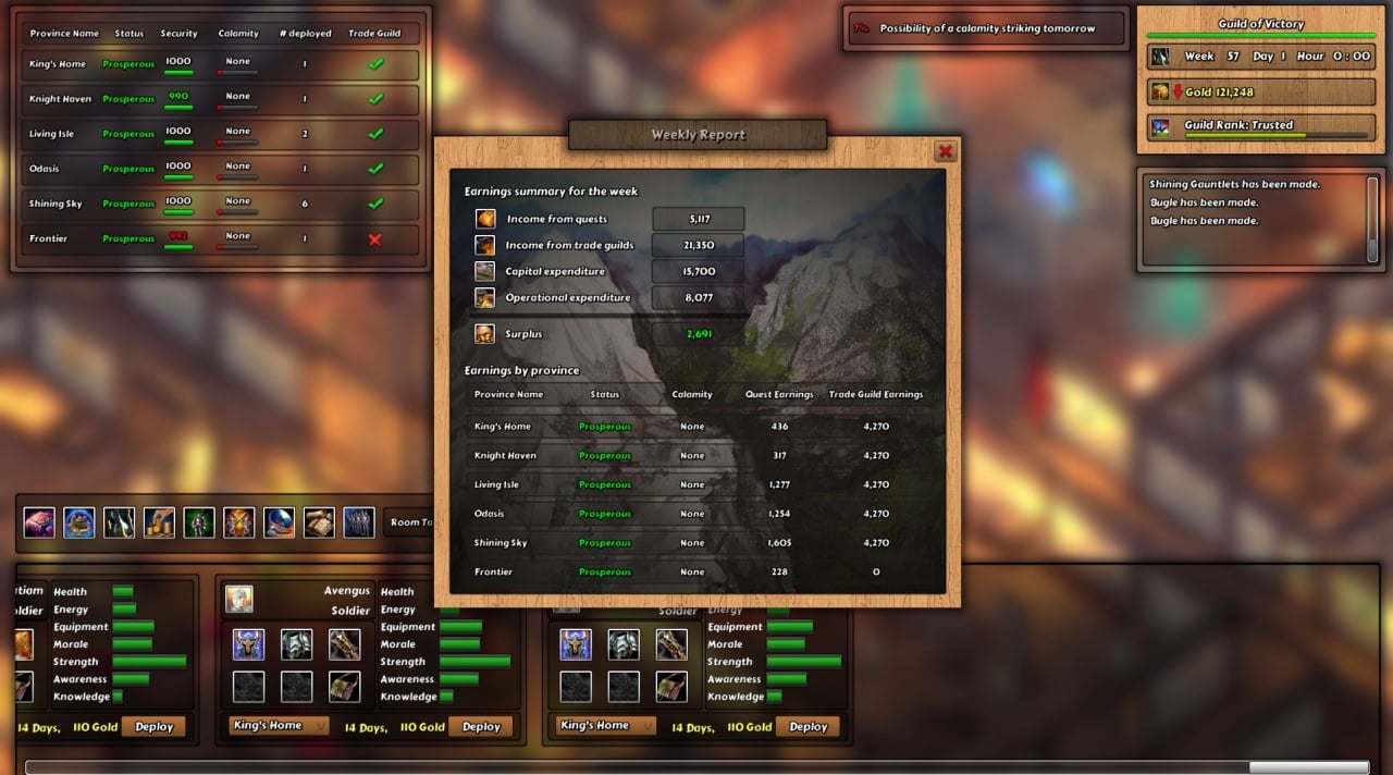 По мере прохождения состав гильдии будет меняться и постепенно пополняться новыми солдатами. Миру грозит ужасающая угроза – Лорд Некро. Противник обладает большой армией, которая способна захватить королевство и установить новый мировой порядок. Геймеру предстоит остановиться Лорда. Для этого необходимо набрать достаточное количество солдат, прокачать их способности и найти лучшее снаряжение. Юзер может строить комнаты, заряжать членом гильдии, а после отправлять их в провинции, где они избавляются от бедствий и повышают безопасность.