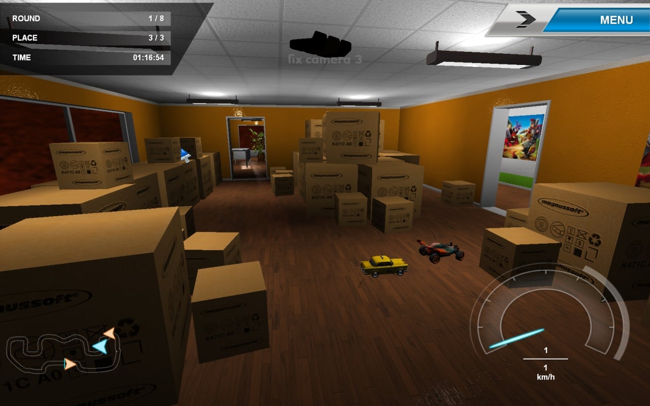 Участники будут соревноваться в разных условиях освещения, в помещении, на улице, комнатах в доме и других территориях. Игрок может выбрать автомобиль перед началом заезда. По мере продвижения геймер зарабатывает деньги, требующиеся для приобретения новых транспортных средств и их модернизации. Средства помогают покупать дополнительные бонусы или изменять внешний вид тачки при помощи наклеек или разных цветов.