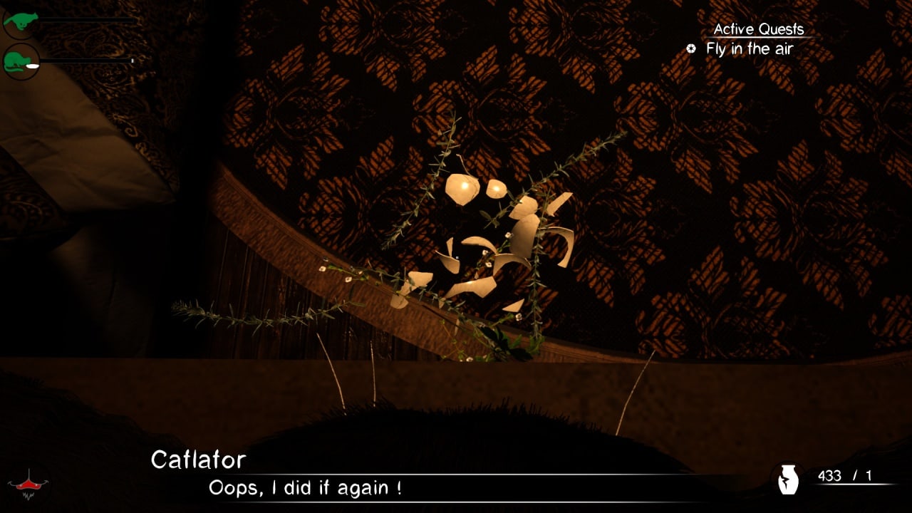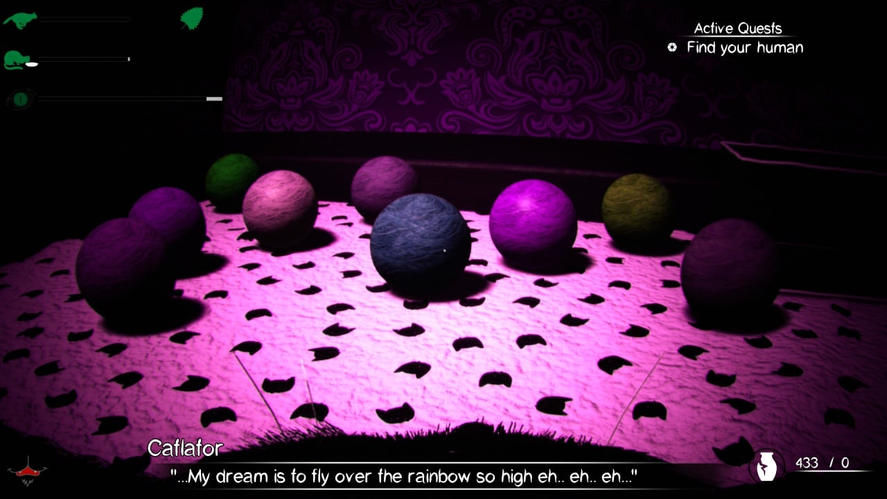 Catsperience предлагает непривычный игровой опыт. Это шуточный симулятор кота. Тайтл смешивает воедино платформер и квест. В нём сочетается вид от первого и частично от третьего лица. Камера находится над макушкой персонажа, из-за чего уши торчат снизу экрана.